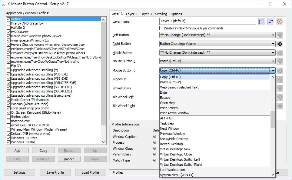X-Mouse Button Control adapte automatiquement la configuration de la souris selon l'application active. Dès qu'une fenêtre passe au premier plan, les boutons changent de rôle sans intervention de l'utilisateur. Chaque bouton, molette incluse, se voit assigner l'action de son choix. Le fichier exécutable (exe) ne touche pas aux entrées sensibles du registre Windows durant l'installation.