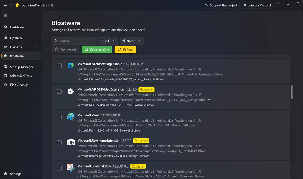 Lorsqu’une optimisation est activée dans l’interface, l’utilitaire exécute des commandes en arrière-plan pour interagir avec le système. Il applique des clés de registre spécifiques pour modifier le comportement de Windows — par exemple, la désactivation de certains services de télémétrie. optimizerDuck lance des commandes à l’aide de PowerShell ou des API Windows natives pour supprimer des paquets logiciels (bloatware), gérer les tâches planifiées ou ajuster les paramètres d’alimentation.