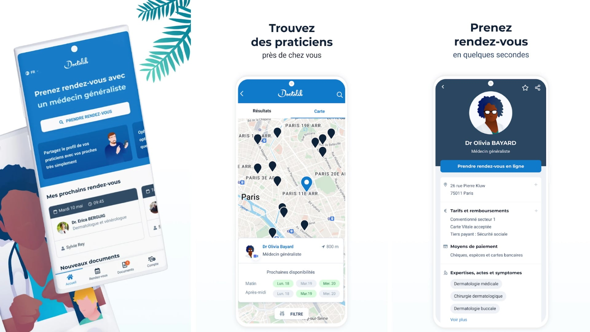 Doctolib vous permet d’abord de chercher un professionnel de santé selon plusieurs critères : spécialité, nom, lieu, ou motif de consultation. Une fois votre recherche lancée, vous voyez les créneaux de rendez-vous disponibles et vous pouvez réserver en quelques clics, 24h/24 et 7j/7, sans appeler le cabinet. Vous choisissez ensuite le type de consultation : en cabinet ou en vidéo. En cas de téléconsultation, vous recevez les informations nécessaires dans l’application et vous pouvez régler le rdv avec un médecin en vidéo si le professionnel le propose.