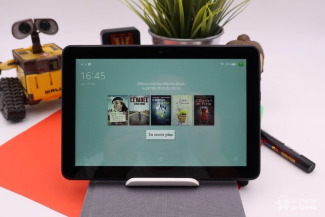 Du côté technique, on retrouve un proceseur quadricoeur cadencé à 2,0GHz avec 2Go de RAM, 32Go ou 64Go de mémoire interne, un port MicroSD (jusqu’à 1To), un port USB-C USB 2.0, le tout dans une taille de 202 x 137 x 9,7 mm pour un poids de 355g. Ce n’est clairement pas la tablette de 8 pouces la plus légère, mais comme son poids est bien réparti, elle ne fait pas lourde en main. Avec une recharge de 4h à 5h, la Fire HD 8 propose une autonomie d’une douzaine d’heures et c’est ce qu’on a obtenu. Pour ce qui est des performances, on est sur une tablette d’entrée de gamme et si on ne pourra pas faire tourner des jeux comme Call of Duty : Mobile par exemple, on n’a pas noté de soucis particuliers pour des petits jeux de réflexion et surtout du contenu multimédia. Que cela soit le navigateur internet, Netflix, Disney+ ou Youtube, tout se lance normalement et surtout, contrairement à ce que proposait encore les tablettes d’entrée de gamme il y a quelques années, l’interface utilisateur est plutôt fluide avec une expérience sans saccade.