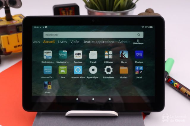 A noter que la tablette est disponible en version « Sans offre spéciale » et « Avec offre spéciale », qu’on peut comprendre par « Sans pub » et « Avec pub ». Si vous ne voulez pas d’écran de veille avec de la publicité, il faudra ajouter 15 euros à l’addition finale. À côté, on retrouve exactement ce dont on est en droit d’attendre d’une tablette Amazon Fire, à savoir une surcouche à Android, Fire OS, mettant en avant les services d’Amazon et pour peu que vous soyez déjà utilisateur des services Amazon, vous pourrez retrouver vos livres et bande dessinée dans l’application Kindle par exemple, votre musique via l’application Amazon Music ou encore du contenu vidéo dans Prime Vidéo. Bien évidemment, on retrouve également d’autres services comme Netflix ou Disney+. En revanche, pas d’Apple TV+ encore. Il ne faut pas oublier qu’il n’y a pas de Google Play Store sur la Fire HD8, on utilise le store d’Amazon et si les développeurs n’ont pas développé de version sans les services Google, point de salut. On dirait presque une expérience similaire à ce que propose Huawei avec ses nouveaux appareils de l’année.