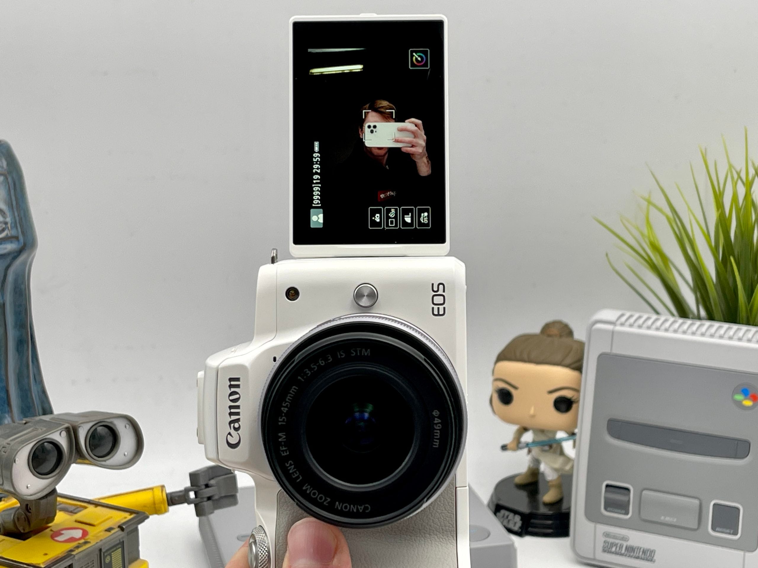 Côté connectique, l’appareil a beau être relativement léger et compact, il propose tout le nécessaire : on retrouve une prise micro d’un côté du boîtier, et de l’autre une prise HDMI et un port micro-USB. Sous le boîtier, on retrouvera un emplacement pour la batterie, ainsi qu’un lecteur de carte SD. Enfin, le Canon EOS M50 Mark II dispose d’un écran tactile de 3 pouces monté sur rotule à l’arrière, et orientable à loisir. On a trouvé cet écran de 1,04 millions de points plutôt bon et assez pratique à l’usage. Le viseur, quant à lui, conserve les 2,36 millions de points de l’EOS M50.