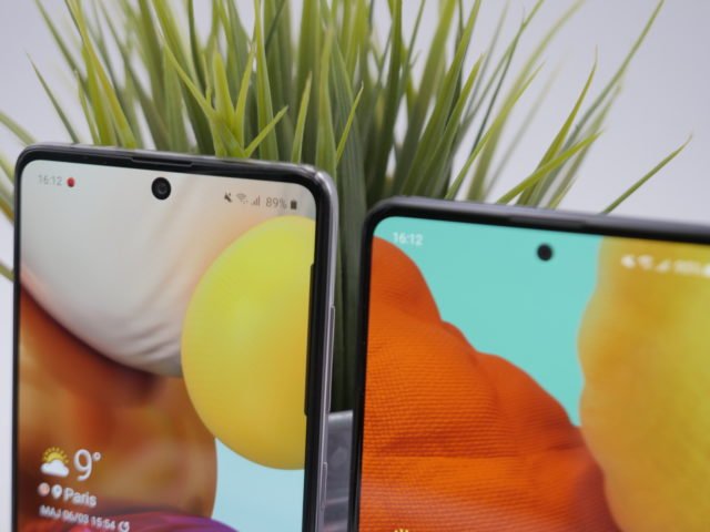 Et enfin, comme précisé plus tôt, les deux nouveaux milieux de gamme de Samsung sont équipés d’un écran poinçonné au centre. Ces capteurs avant sont identiques en terme de résolution (32 mpx), mais le contour noir autour de celui du Galaxy A71 est plus gros et semble occuper plus de place au centre que celui du A51 et se remarque donc plus quand on regarde du contenu vidéo.