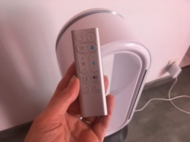 Comme tous les purificateurs Dyson, le Pure Humidify+Cool peut être connecté en Wi-Fi. Mais il reste possible d’utiliser quasiment toutes les fonctionnalités même sans le connecter. Il dispose en effet d’une télécommande qui s’aimante sur le dessus de l’anneau – pas inédite chez Dyson mais toujours aussi pratique pour ne pas l’égarer. Elle donne accès aux modes et réglages, hormis la programmation ici restreinte à un minuteur.
