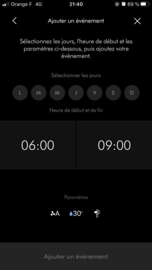 Une fois connecté au réseau Wi-Fi, il peut être entièrement contrôlé à distance via l’application Dyson Link (iOS et Android). Celle-ci permet également de planifier son fonctionnement de manière détaillée (jours et plages horaires). Cette fonction pratique permet par exemple de le faire fonctionner un peu avant son retour à la maison, d’arrêter systématiquement le mode automatique en soirée ou de planifier le mode nuit tous les soirs…