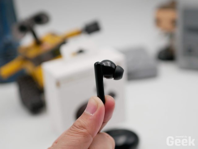 Concernant le boitier, il est petit et discret. On l’a testé dans sa version noire et on a apprécié un des côtés qui se retrouve être plat pour justement ne pas bouger quand le boitier est posé sur une table. Encore une fois, ce n’est pas grand chose mais c’est pratique. La recharge se fait via un port USB-C et à ce prix, inutile de rappeler qu’il ne propose pas de recharge sans-fil. Le packaging est des plus classiques avec les embouts supplémentaires et un câble USB-C de recharge. A noter que ce dernier est de longueur correct, ce qui n’est pas monnaie courante puisque les concurrents ont tendance à proposer un câble d’une dizaine de centimètres seulement.