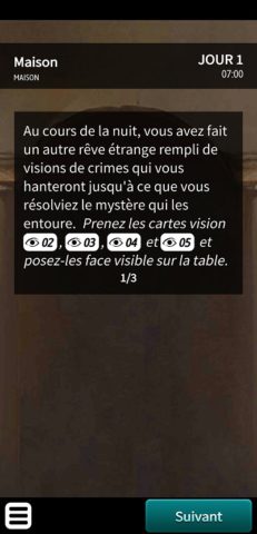 Après avoir examiné ces visions, l’application vous donne les premiers détails sur le crime et vous indique quel(s) plateau de lieu placer sur la table et les personnes et/ou indices à votre disposition pour commencer l’enquête. Quand vous savez où se trouve une personne, vous placez sa carte sur le plateau de lieu correspondant, sinon la carte est placée sur le plateau central. De même, les objets que vous avez en votre possession sont placés sur la partie rouge du plateau principal tandis que les objets dont vous ne connaissez que l’existence sont placés sur la partie bleue (nouveauté de cet épisode).