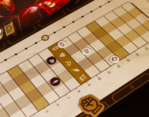 À la fin de la partie, vous gagnez des points de prestige ou de convoitise en fonction de divers critères dont un objectif secret que vous avez obtenu au début de la partie. Vos scores de Prestige et de Convoitise augmentent ainsi au fil des parties, sans pour autant savoir ce qu’ils valent réellement. Ce ne sera qu’à la fin de la campagne que vous connaîtrez la méthode pour connaître le classement entre les joueurs. Cela a un côté frustrant, mais c’est une très bonne chose pour éviter d’influencer vos choix lors des parties.