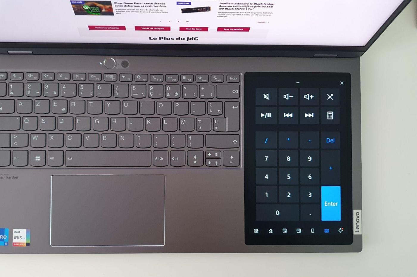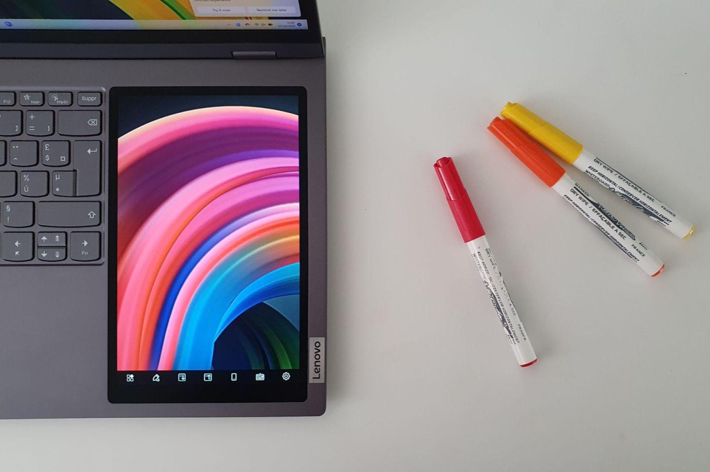 Lenovo a pris le parti de le rendre aussi polyvalent que possible. Il peut servir de surface d’affichage d’appoint au service de la productivité ou se transformer en pavé numérique, ce qui est toujours bienvenu sur un portable. Il peut aussi faire office de bloc-notes ou de petit carnet à dessin grâce à la prise en charge du stylet. Lenovo a d’ailleurs eu le bon goût d’en intégrer un dans une petite encoche à l’arrière du châssis — même s’il est assez rudimentaire. La bonne nouvelle, c’est que le Precision Pen 2 de Lenovo, bien plus performant, est fourni.
