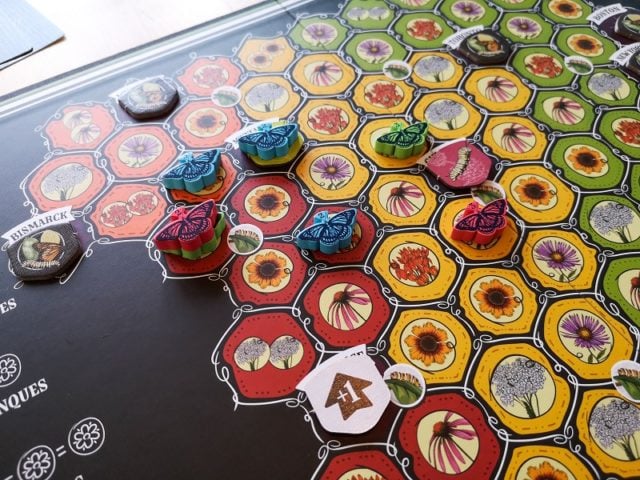 Chaque joueur commence avec un papillon de la première génération et 2 cartes actions. A votre tour, vous devez jouer une carte action de votre main et résoudre les déplacements indiqués. Ces cartes permettent de déplacer un seul papillon d’un grand nombre de cases, plusieurs papillons de moins de cases ou plusieurs fois le même papillon sur de courtes distances. A chaque fois que votre papillon termine son mouvement sur une fleur, vous collecter un jeton fleur correspondant. Ces jetons permettent à vos papillons de se reproduire s’ils terminent leur mouvement à côté d’un symbole plante. Les papillons de 1ère génération ne donnent naissance qu’à des papillons de 2e génération qui donnent naissance à des papillons de 3e génération et ainsi de suite. Plus vous avancer dans les générations et plus le coût en jeton fleur est élevé. Vous devez donc optimiser vos déplacements pour faire des lots de fleurs identiques afin d’obtenir des naissances. Ces naissances sont importantes car à chaque fin de saison, la génération précédente est retirée du plateau. A la fin de la partie il ne reste donc plus que des papillons de génération 4.