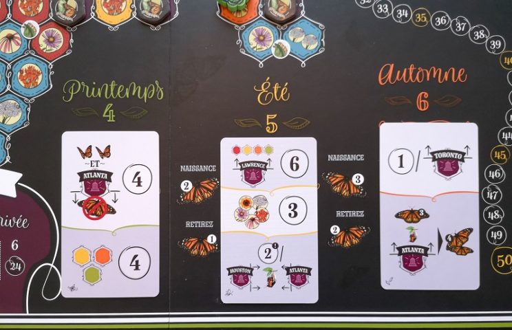 La gestion des déplacements et des naissances est également importante pour vous assurer d’avoir la bonne quantité de papillons dans les bonnes zones du plateau afin de valider les objectifs de fin de saison. Vous connaissez l’objectif de la première saison dès le début de la partie, mais les suivants ne sont dévoilés qu’au début de la manche suivante, ou avant si tous les joueurs ont fait suffisamment de naissances pour les dévoiler. Il y a des objectifs géographiques qui vous forcent, sans en avoir l’impression, à respecter le parcours migratoire des papillons, et des objectifs de collections de fleurs, de placement sur des couleurs de cases spécifiques ou autours de villes… Ces objectifs sont tirés aléatoirement parmi 20 cartes. De quoi avoir une belle rejouabilité.