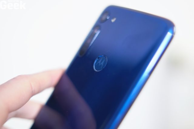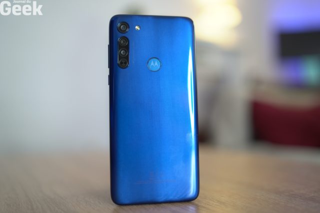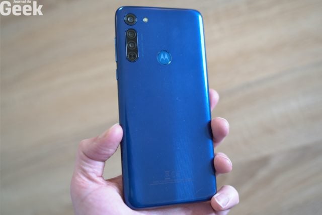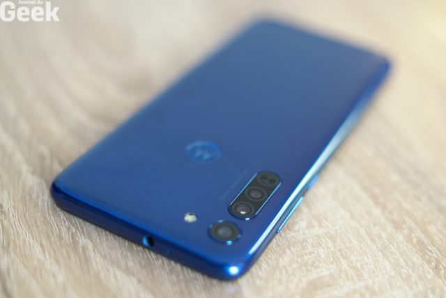 Le smartphone reste néanmoins plutôt bien fini. À l’arrière, on profite d’une finition plastique, certes, mais de qualité. La matière, qui se dote de beaux reflets selon la lumière, accroche suffisamment les doigts pour permettre une bonne prise en main, malgré la taille du smartphone. Elle permet également au smartphone de se montrer plutôt léger et solide. Plastique oblige, on ne retrouve pas la recharge sans fil, mais on trouve au dos un capteur d’empreinte digitale assez bien placé qui arbore le logo de la marque. Aussi, on retrouve à l’arrière les capteurs photo, placés en ligne, qui ont l’avantage de ne presque pas ressortir du boîtier, ce qui permet de poser le smartphone sans coque sur une table sans que celui-ci ne devienne bancal. C’est, aujourd’hui, suffisamment rare pour le mentionner. Autre particularité devenue bien rare sur les smartphones : la prise jack. Le petit trou de 3,5 mm est bel et bien présent sur le Moto G8, placé sur la tranche supérieure du smartphone. Toujours au rang de l’audio, on profite d’un simple haut parleur plutôt puissant.
