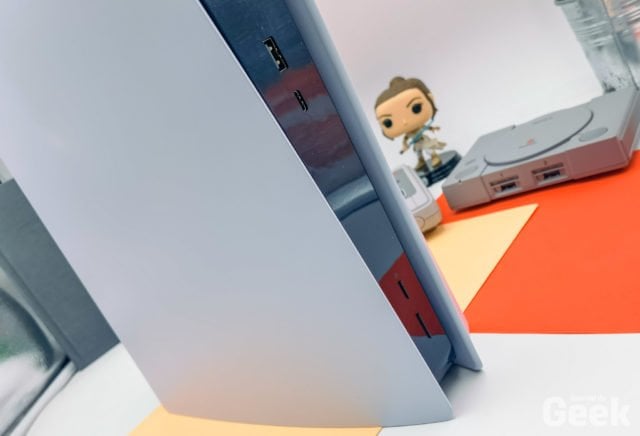 Concernant la finition, rien de spécial, la finition est de bonne qualité et la seule chose qui peut faire peur à long terme, c’est de voir le blanc de la console jaunir avec le temps. C’est souvent le cas malheureusement avec le plastique blanc. On se souvient de notre PS4 blanche, enfin, jaune maintenant. Maintenant, ne boudons pas notre plaisir, si on regarde bien le revêtement de la console, il y a des milliers de Croix, Carré, Triangle et Rond, soit les fameuses touches de Playstation, on adore !