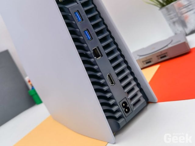 En façade, on retrouve un port USB-A et un port USB-C ainsi que les boutons d’éjection de Blu-Ray et d’alimentation. Sans surprise, au dos, on retrouve deux ports USB-A, un port Ethernet, un port HDMI et un port d’alimentation.
