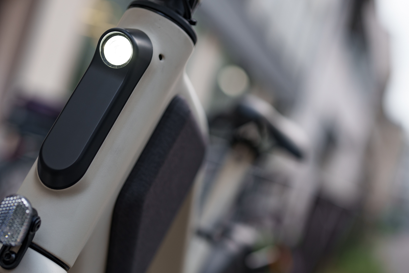Revenons à l’écran monochrome un instant : il est situé sur le tube supérieur comme Vanmoof (encore). Il est cependant plus lisible puisqu’il s’agit d’un écran à l’affichage monochrome positif. Point de vitesse devant les yeux, ce qui dérangera déjà moins que dans une auto.