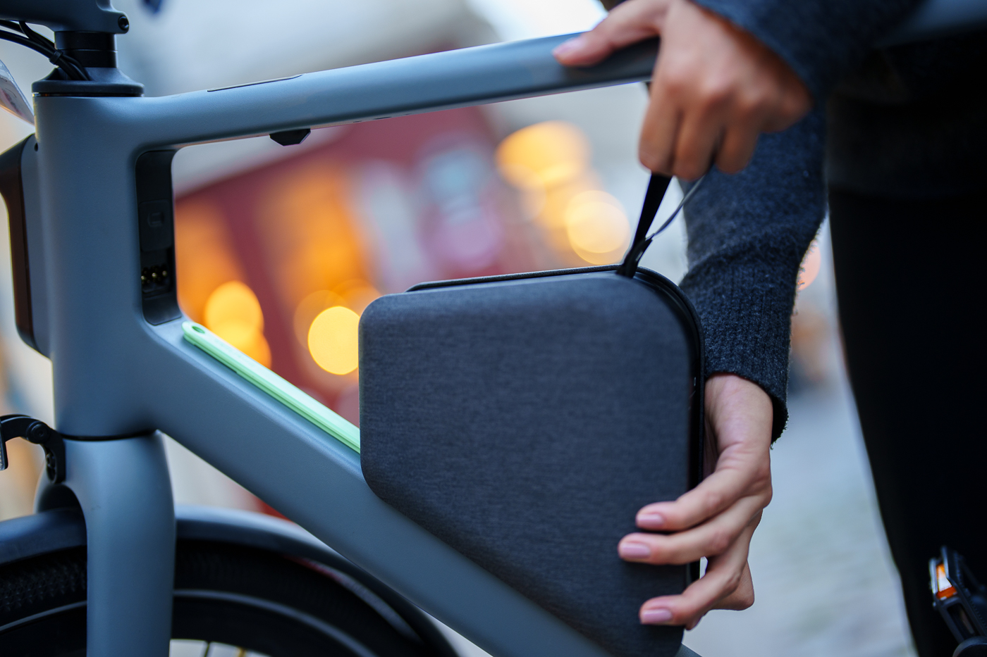 Ce pack batterie, parlons-en. Le travail effectué dessus est remarquable. Il est joli, bien intégré au vélo. Il contient l’ensemble de l’électronique nécessaire et forcément la batterie. Cela donne un triangle de 3kg. Le branchement au vélo se fait via un rail et une fixation avec verrouillage de sécurité. Il n’y a alors qu’un câble intégré au cadre qui relie ce pack au moteur de 250W logé dans le moyeu de la roue arrière. Le revêtement en tissu et la lanière intégrée sont en accord avec la philosophie de la marque de ne pas proposer simplement une batterie de vélo, mais une sorte de puissante powerbank de 530Wh en l’occurrence ici et de 65W de puissance et doté de deux sorties (USB-A et USB-C). Lemmo annonce 3,5 heures de temps de charge. Mais nous n’avons évidemment pas pu tester cela en si peu de temps.