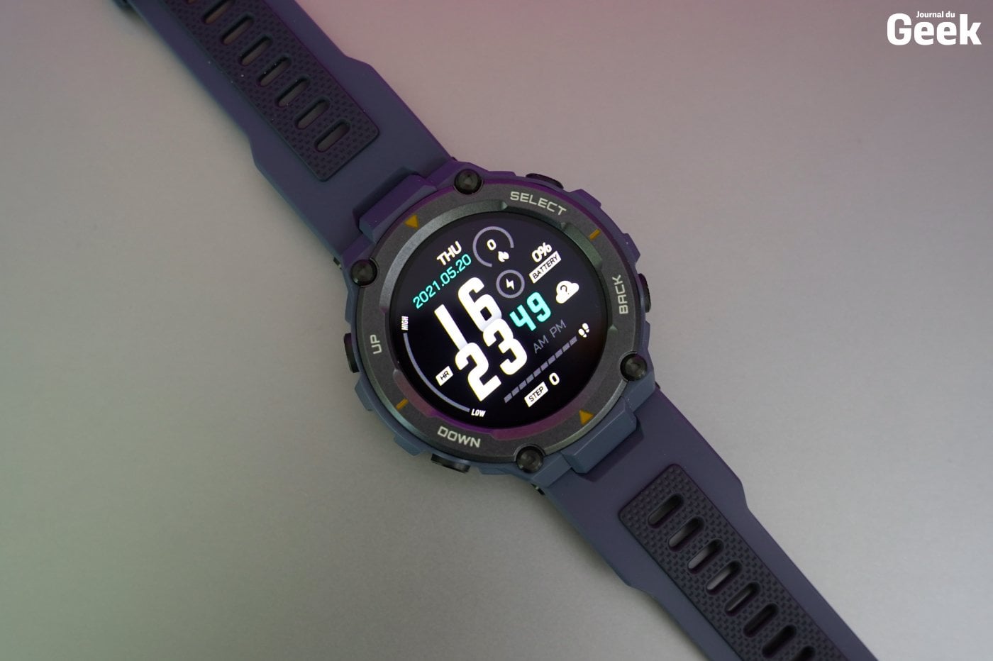 À l’avant, on retrouve un cerclage bien visible sur lequel sont inscrits les fonctions des quatre boutons en métal disposés de part et d’autres du cadran : Up, Down, Select et Back. Sous la montre, on retrouve l’emplacement pour la recharge, un capteur PPG pour mesurer la fréquence cardiaque et l’oxygénation du sang, mais hélas, pas de haut-parleurs ni de microphone.