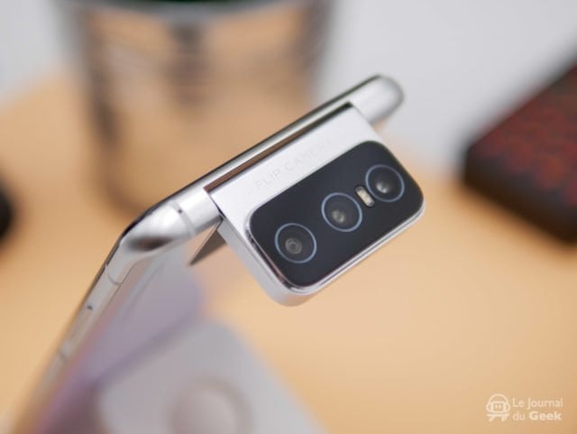 Comme on l’a dit plus haut, le Flip Camera a évolué avec non seulement un nouveau moteur et une meilleure finesse de déploiement. Mais ce n’est pas tout, il est plus grand et ce n’est pas innocent puisqu’il intègre désormais trois appareils photo, contre deux l’année dernière. On retrouve ainsi un appareil photo principal avec un capteur Sony IMX686, très en vogue en ce moment, un ultra grand-angle et un téléphone. L’application a quelque peu évolué aussi puisqu’en dehors des mode HDR+ ou mode Nuit, Asus propose désormais un mode Vidéo Pro où l’utilisateur pourra utiliser ses propres réglages. On notera aussi un mode ultra-stabilisation comme beaucoup le propose et qui s’apparente à une sorte de mode Action-Cam.