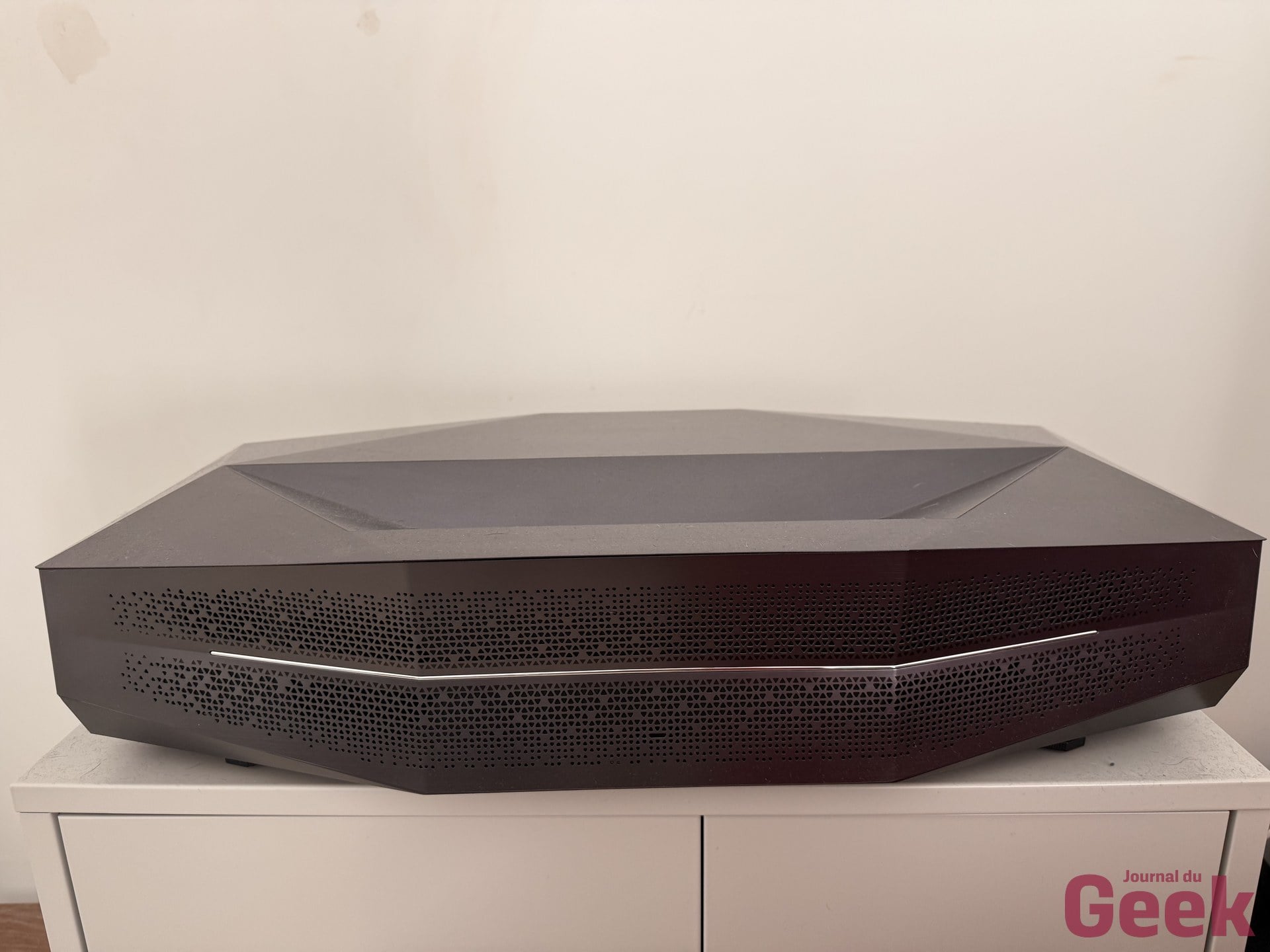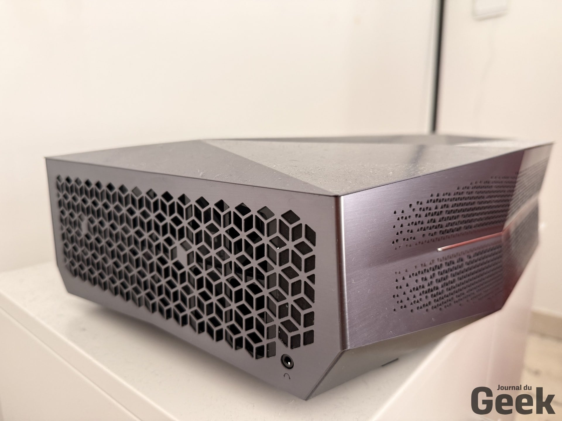 La première chose qu’on remarque en sortant l’Aetherion Max de son carton, c’est qu’AWOL a visiblement décidé d’arrêter de faire semblant. Fini le bloc blanc anonyme qu’on cache sous la télé par honte esthétique. Ici, le châssis est entièrement en métal, avec une finition qui imite l’aluminium brossé, des lignes anguleuses qui lorgnent clairement du côté cyberpunk, et une barrette chromée en façade qui donne au projecteur des airs de vaisseau spatial posé sur votre meuble TV. C’est assumé, c’est volontaire, et franchement, ça fonctionne.