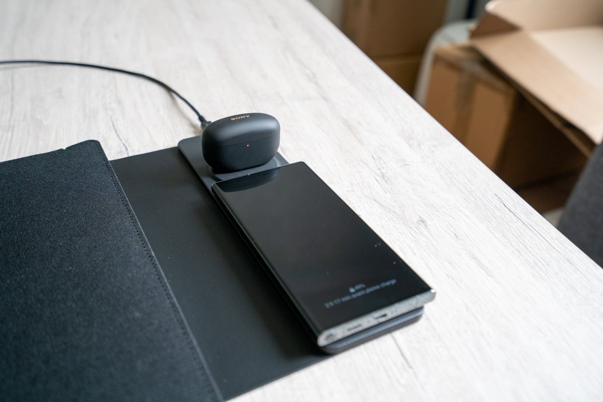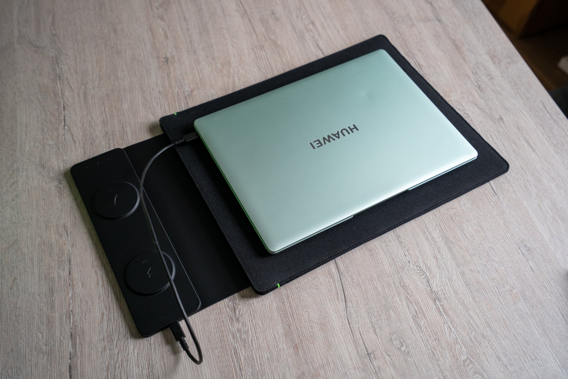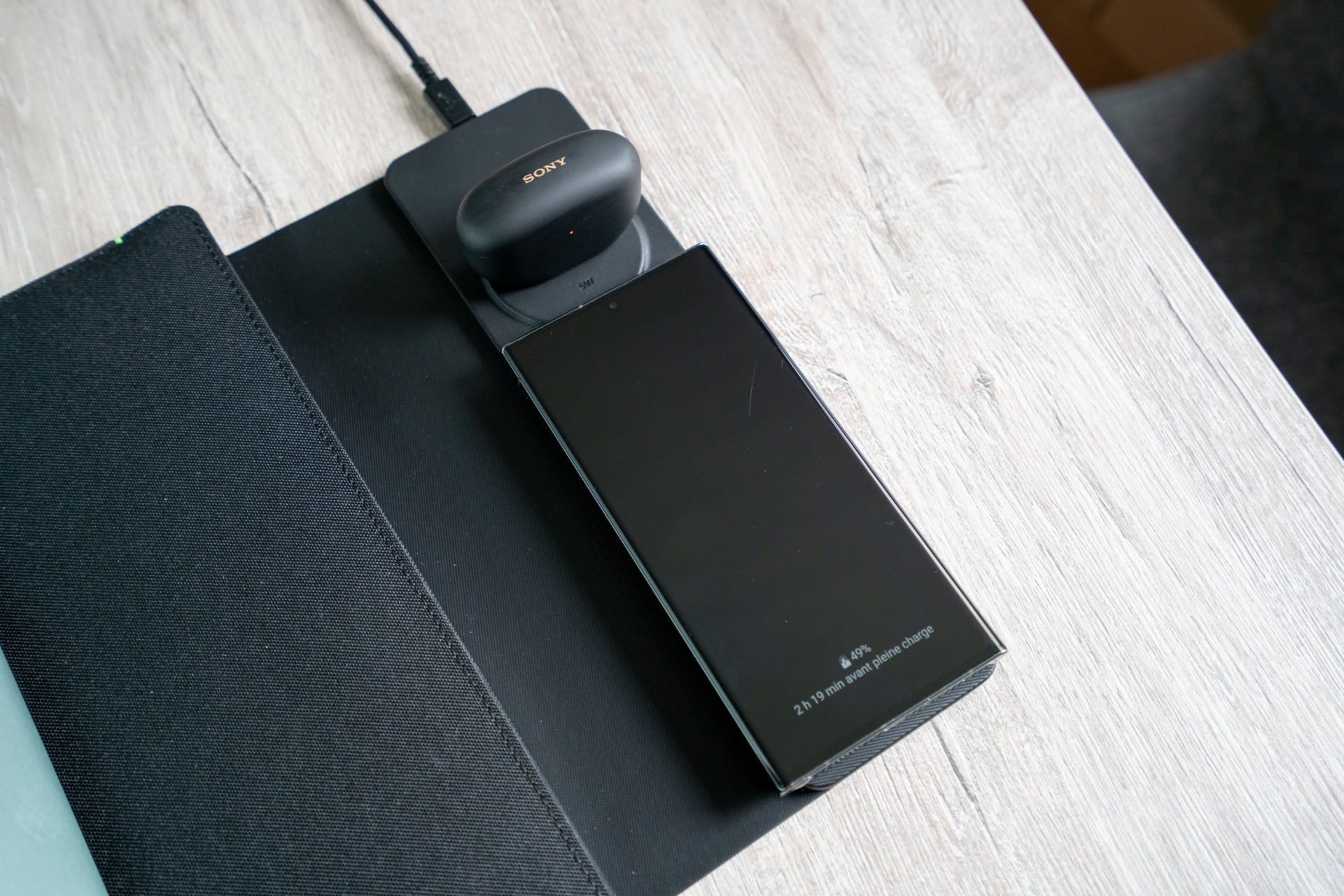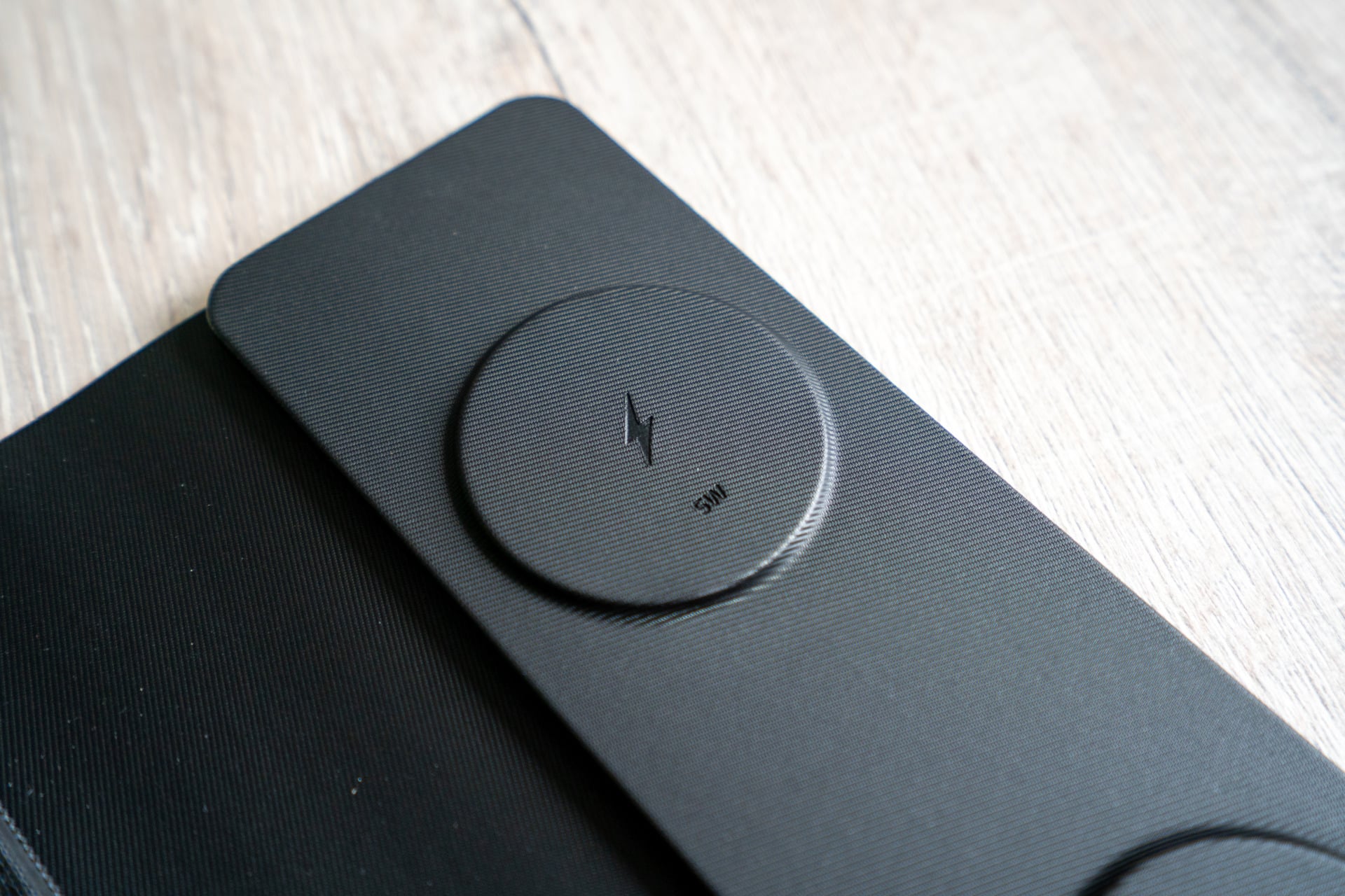Le concept, c’est que le rabat de la housse embarque deux zones de recharge à induction : une à 15W et une à 5W. Vous posez votre téléphone d’un côté, vos écouteurs de l’autre, et hop, tout se recharge pendant que vous bossez. Sur le bureau, ça peut même servir de petit tapis de recharge portable. Pour les adeptes du flexoffice ou ceux qui aiment un setup minimaliste, c’est indéniablement pratique.