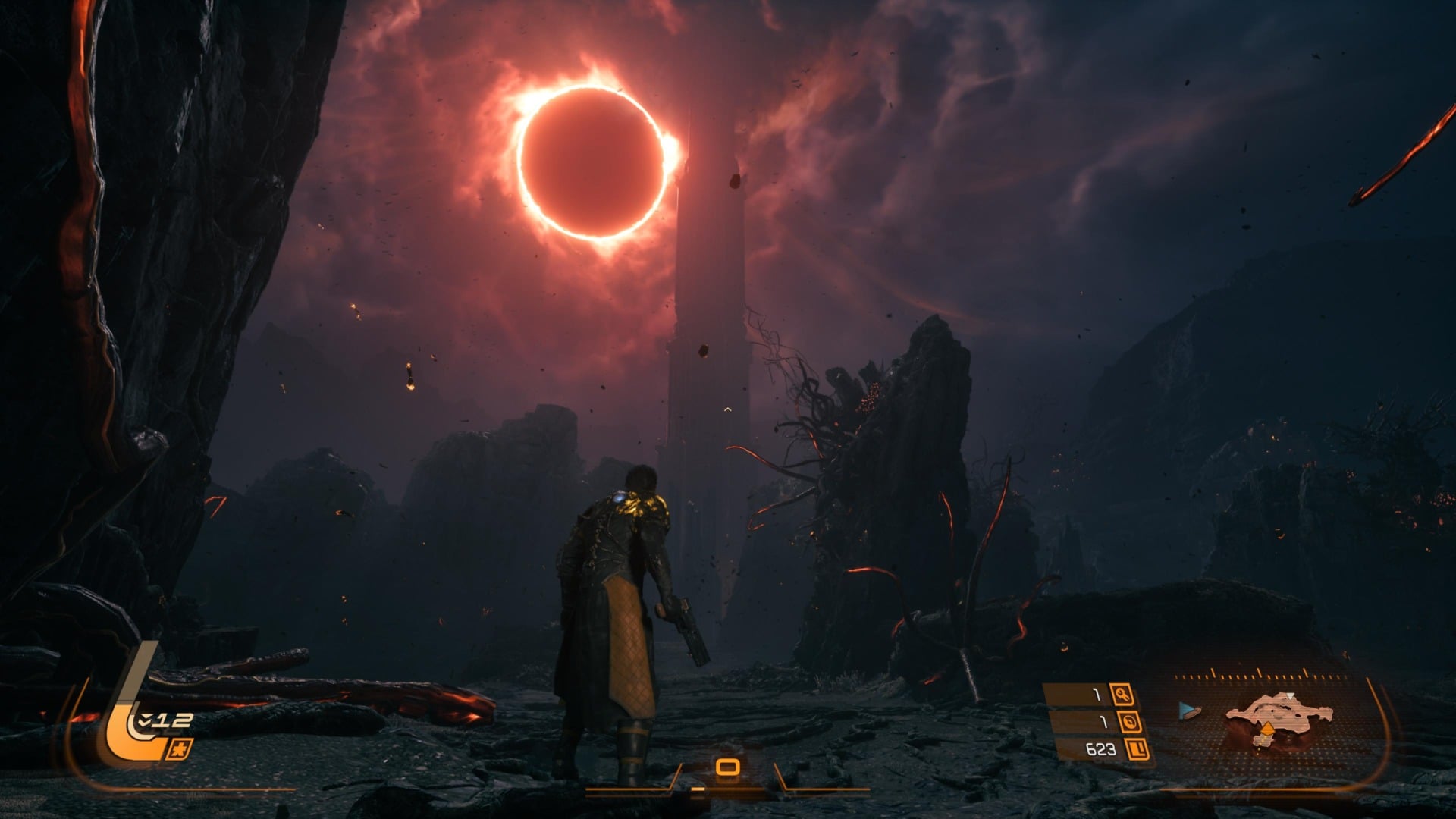 Saros introduit plusieurs mécaniques qui enrichissent ses runs, à commencer par son système d’éclipse. Toujours lié à la narration, il intensifie les combats tout en ajoutant une couche de risque via des bonus couplés à des malus. Si la plupart du temps son activation est dictée par la progression linéaire de l’histoire et de la construction des biomes (qui respectent des étapes identiques malgré la reformation des zones), il est parfois possible de choisir de l’activer ou non manuellement, ce qui ajoute une vraie dimension stratégique. On ne joue pas seulement pour survivre, mais aussi pour optimiser ses récompenses.