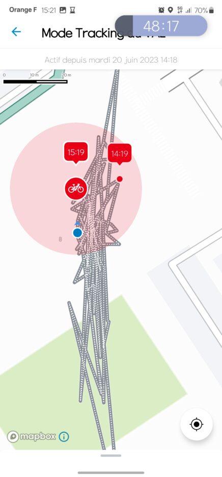 L’accueil réunit l’essentiel et c’est la géolocalisation qui retient logiquement notre attention. Le système est assez précis et affiche même les différents mouvements. Sauf quand il bugue. Voici l’image du parcours effectué pendant cette simulation de vol (vélo verrouillé, batterie retirée, Bluetooth du téléphone désactivé). Le vélo a changé de quartier. Dans la réalité, il est resté à sa place.