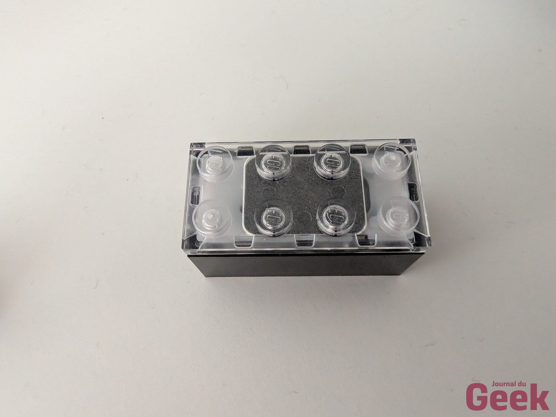 La Smart Brique se présente comme une brique LEGO standard 2×4, transparente, avec quatre picots lumineux. Elle s’insère dans n’importe quel modèle comme une pièce ordinaire. À l’intérieur se trouve une puce ASIC qui mesure de 4,1 mm, plus petite qu’un tenon de LEGO standard, accompagnée d’un ensemble de capteurs conséquent : accéléromètre, capteur de couleur et de lumière, capteur sonore (microphone), réseau de LED RGB, haut-parleur miniature piloté par un synthétiseur embarqué, capteurs de champ magnétique pour la détection de proximité et d’orientation, et une puce Bluetooth 5.4 pour la communication entre briques via le protocole BrickNet. Une batterie rechargeable par induction complète l’ensemble.