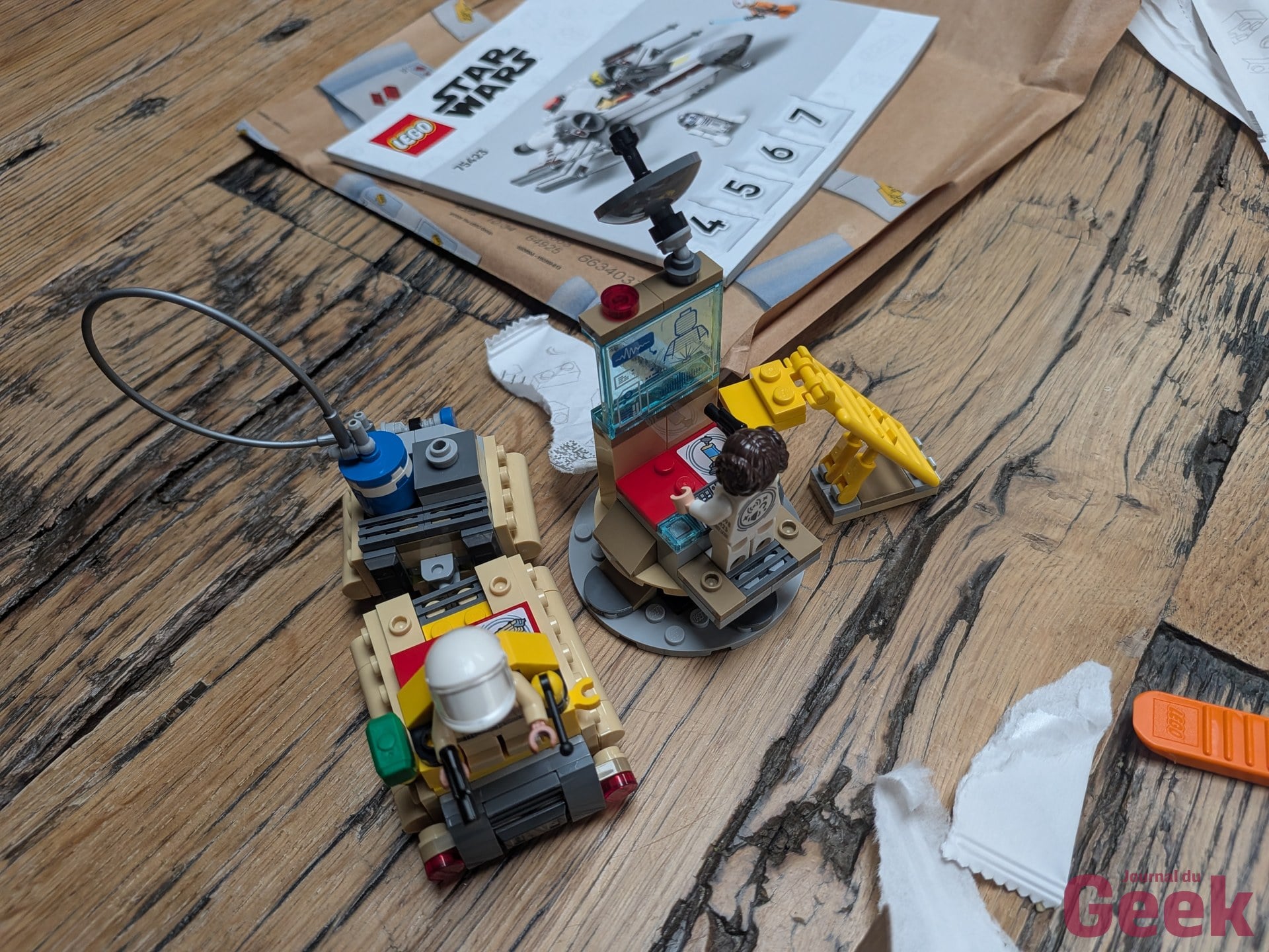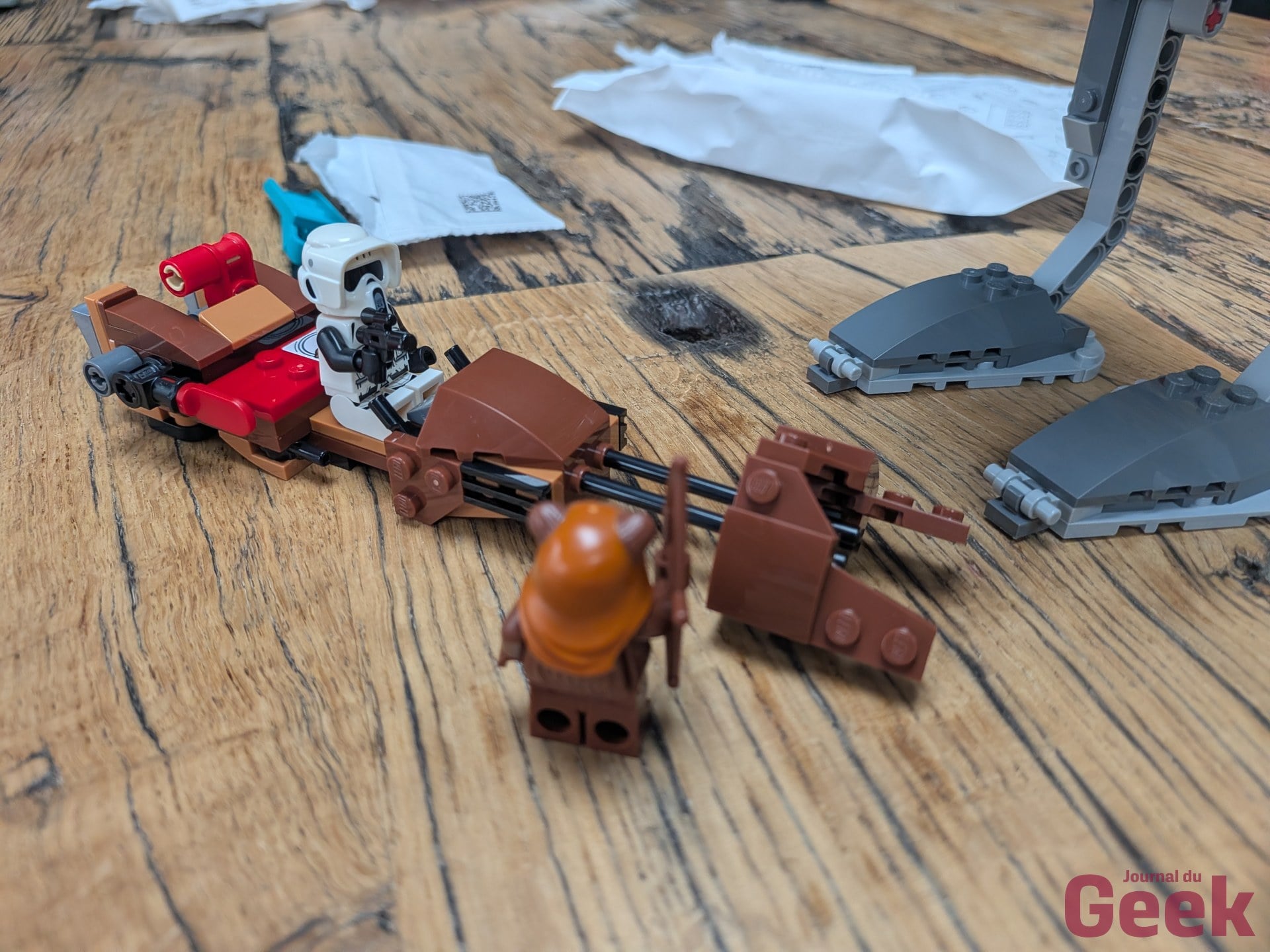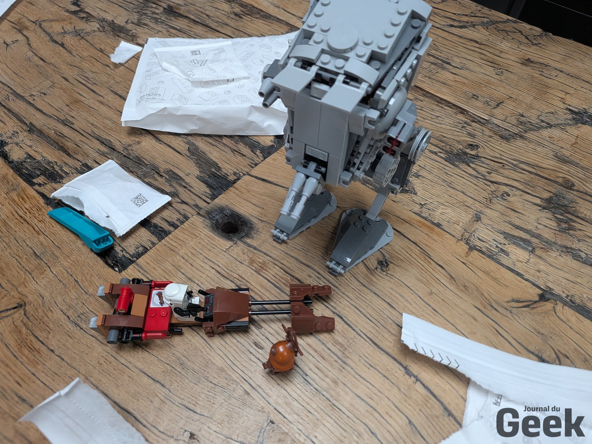 Une fois la Smart Brique du X-Wing insérée dans l’AT-ST, les interactions fonctionnent correctement : bruits de moteur du marcheur, sons de speeder bike, tirs laser activés par les tags. L’expérience est moins riche que sur le X-Wing, avec seulement deux tags au lieu de cinq, mais elle est cohérente, sans oublier la minifigurines Ewok et ses petits grognements. Pour les familles qui entrent dans l’écosystème par le 75423, l’AT-ST est un complément légitime à 49,99 euros. Pour ceux qui le prennent seul, c’est un set LEGO classique légèrement surpayé.