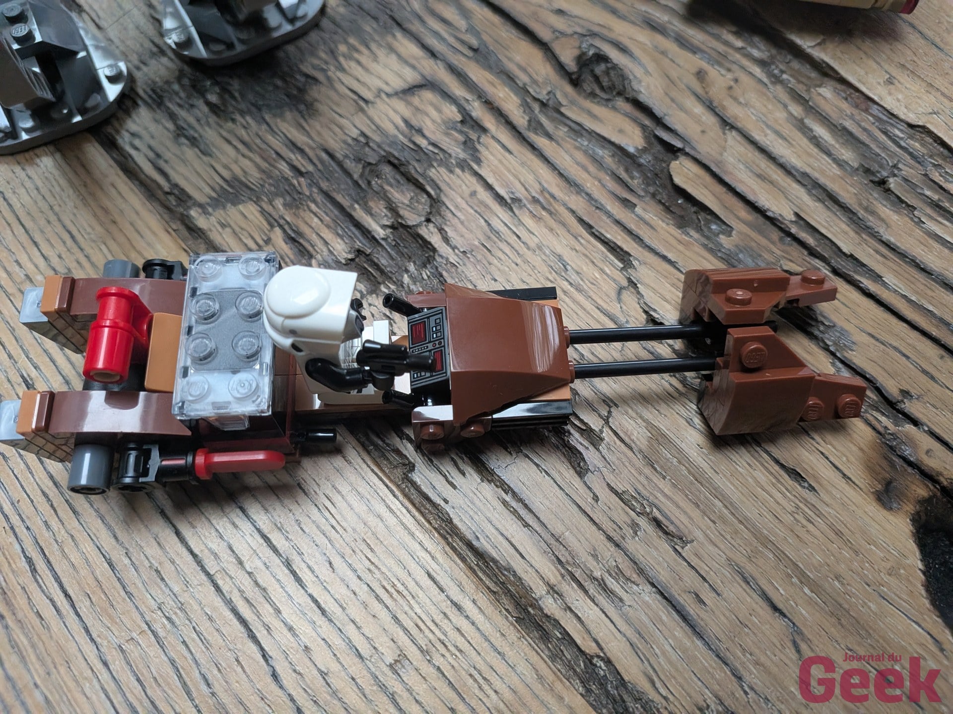 Mais la promesse de la gamme Smart Play est conditionnelle sur l’AT-ST. Sans Smart Brique, les deux Smart Tags inclus, l’AT-ST et le speeder bike, ne servent strictement à rien. Les sons de moteur, les bruits de marche mécanique et les tirs laser que promet la boîte n’existent pas si on n’a pas dépensé 89,99 euros sur le set 75423 ou l’un de ses équivalents. Ce n’est pas clairement expliqué sur le packaging : la mention “Smart Brick not included” figure en anglais en petit caractère, mais l’expérience visuelle de la boîte laisse penser qu’on achète un produit interactif. Ce n’est pas tout à fait faux, mais ce n’est pas tout à fait honnête non plus.