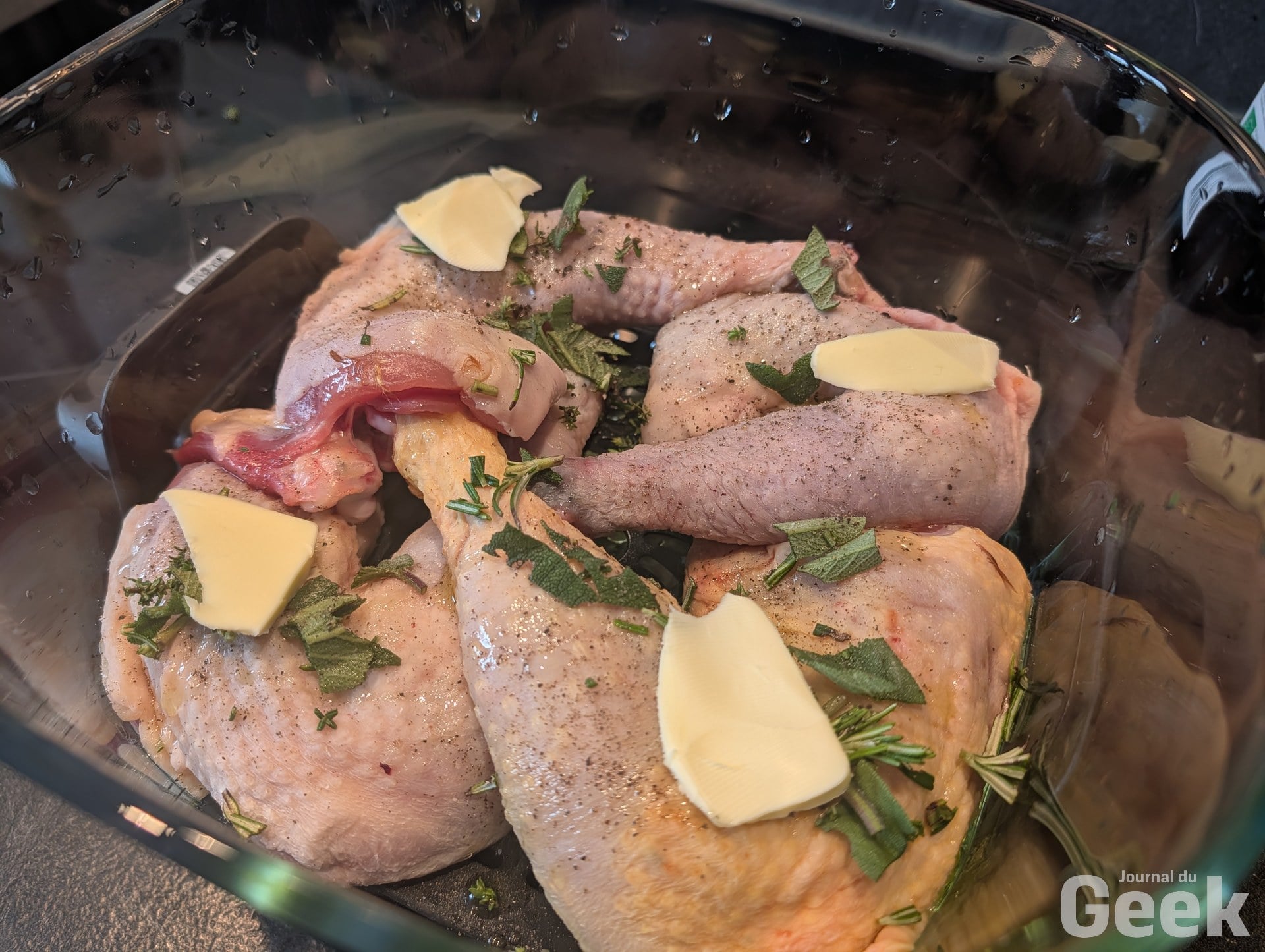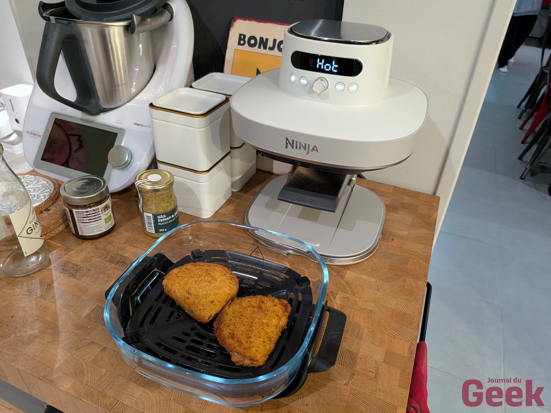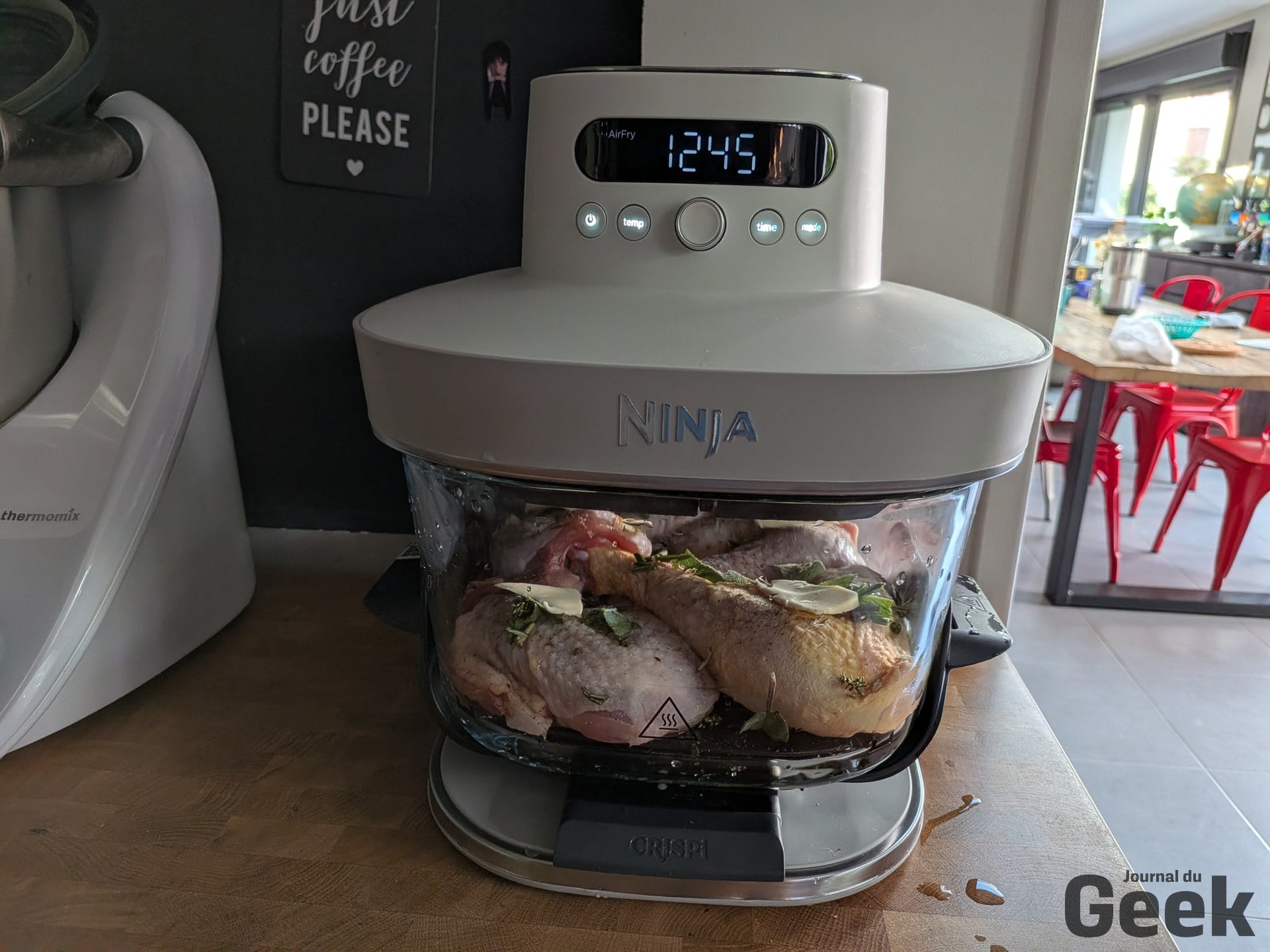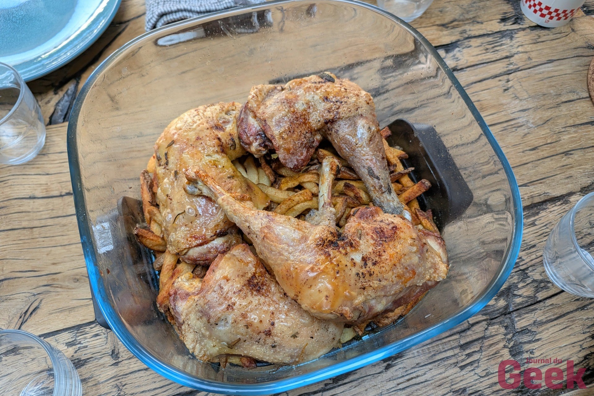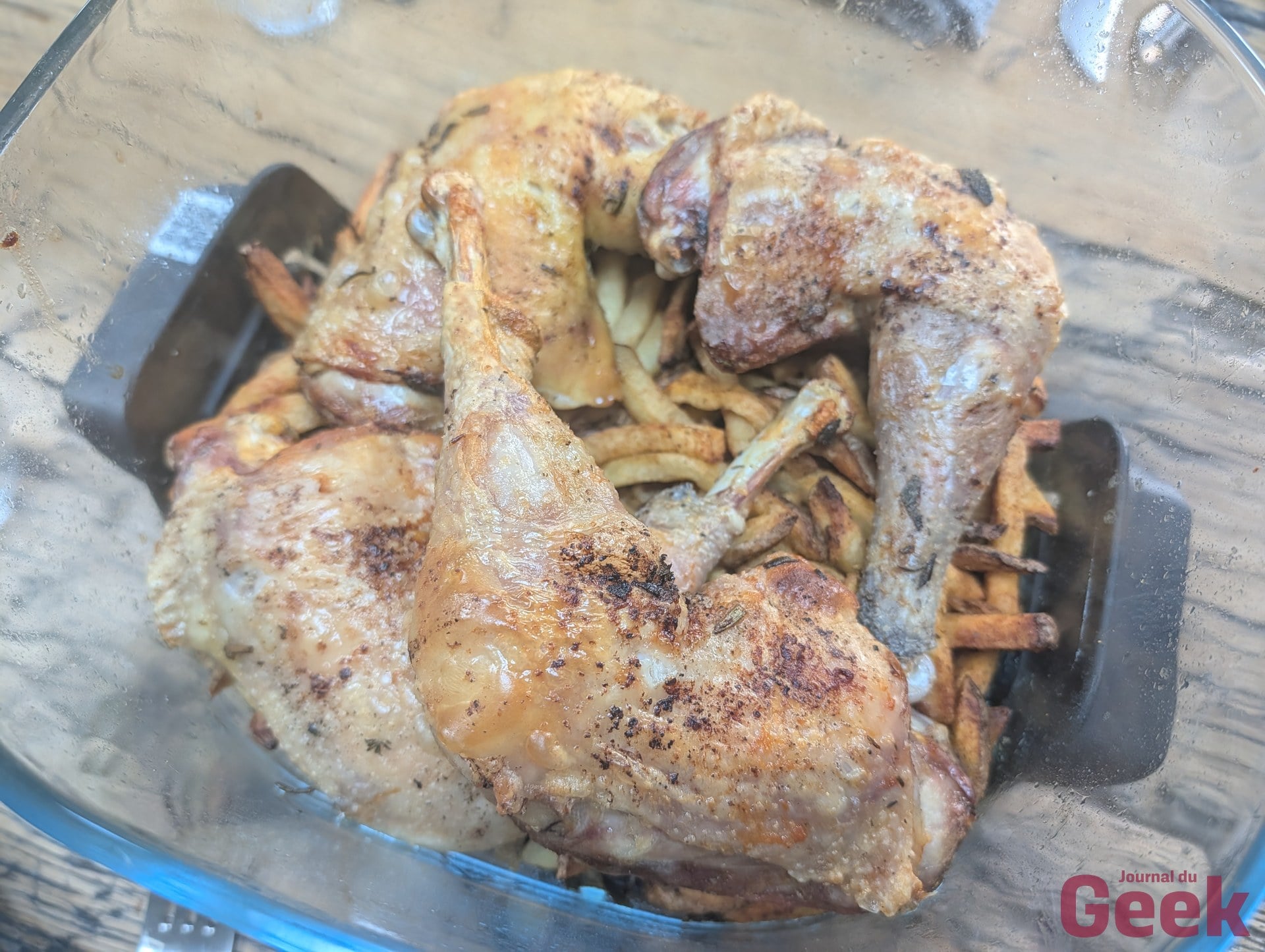Sur une semaine de test au quotidien, le Crispi Pro s’est imposé comme appareil principal en remplacement de mon air fryer double zone, ce qui en dit long sur la confiance qu’il inspire rapidement. La volaille en mode Roast donne des résultats nets : peau croustillante, chair juteuse, et la cuisson se fait sans avoir à retourner le morceau à mi-parcours grâce à la circulation d’air qui passe à la fois au-dessus et en dessous de la plaque crisper. Poulet avec frites en moins de 30 minutes au total, en cuisant les deux simultanément dans le grand bol. C’est exactement la promesse d’un air fryer familial tenue.