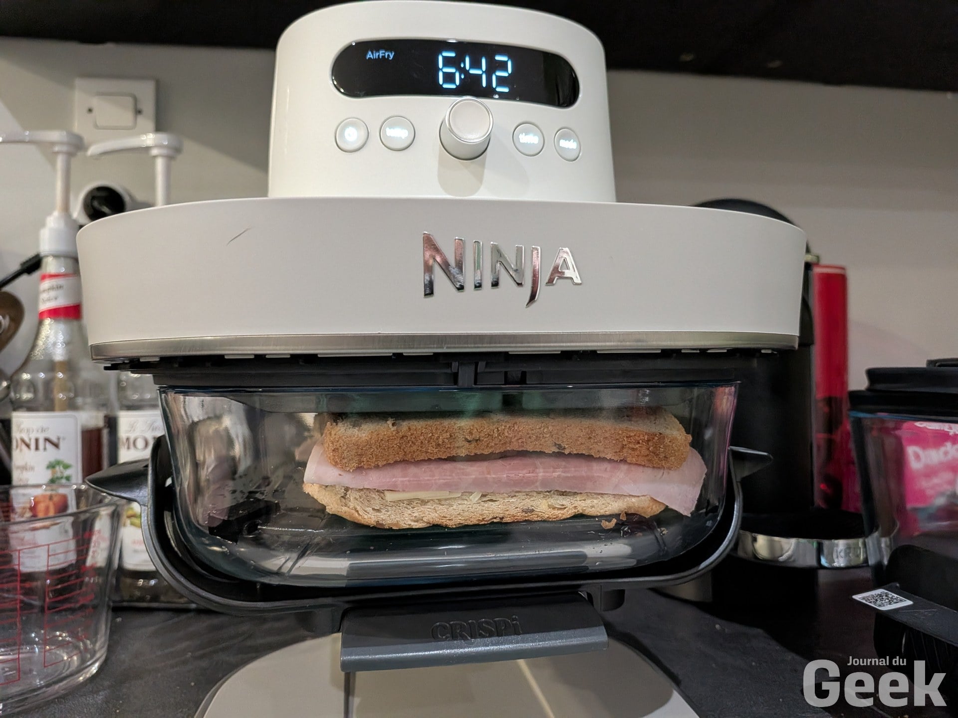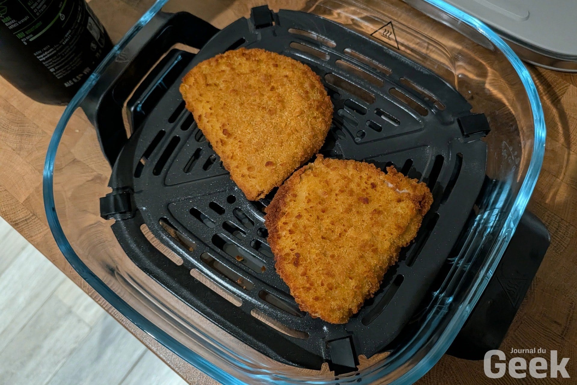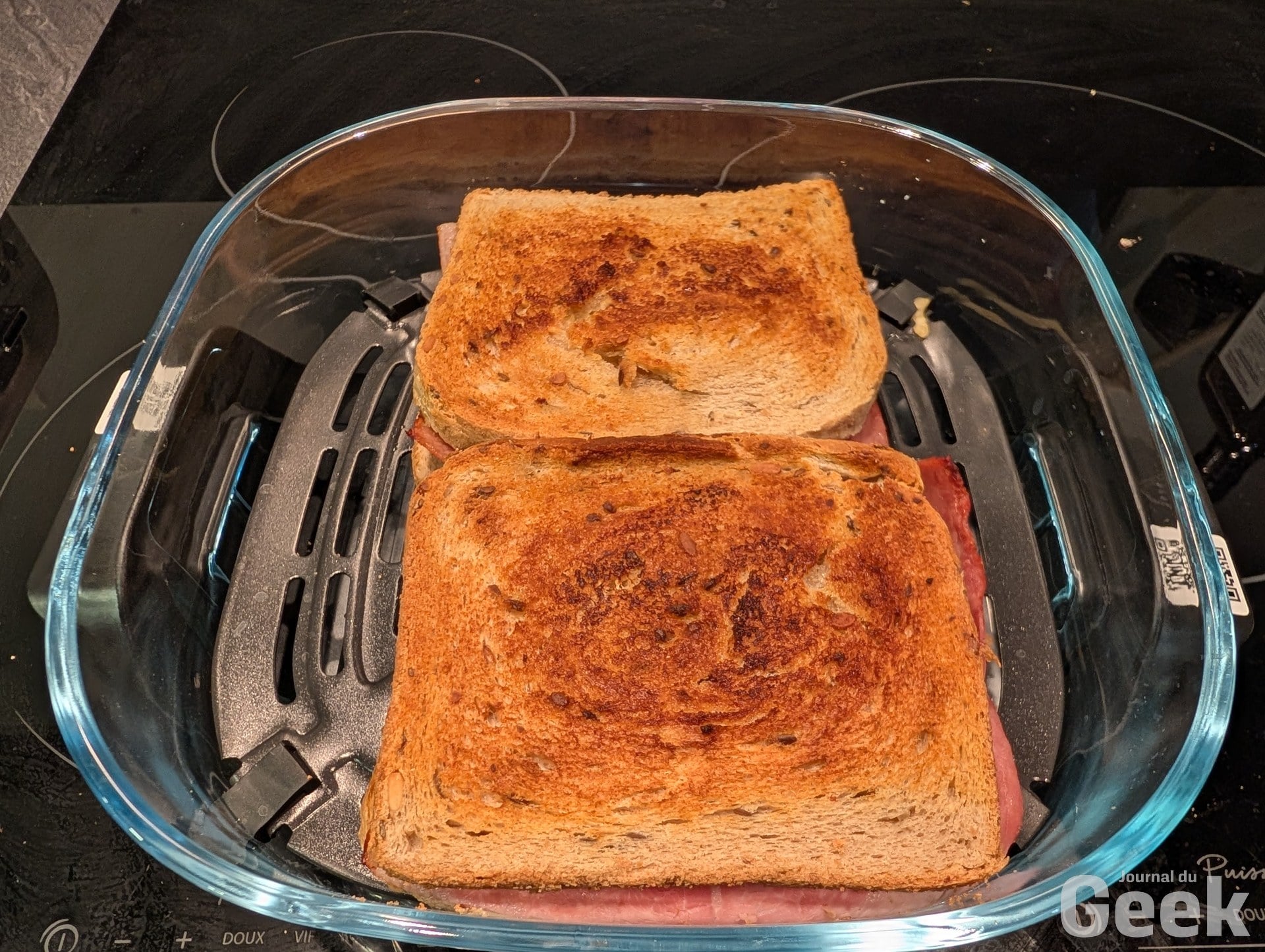 Le mode Air Fry fonctionne aussi très bien sur des plats moins attendus. Un croque-monsieur passe au Crispi Pro sans problème : le pain dore uniformément, le fromage fond sans brûler, et la transparence du bol permet de surveiller la cuisson au bon moment sans ouvrir l’appareil et perdre de la chaleur. C’est un usage simple mais révélateur, l’appareil gère aussi bien les cuissons rapides et légères que les pièces de viande plus longues.