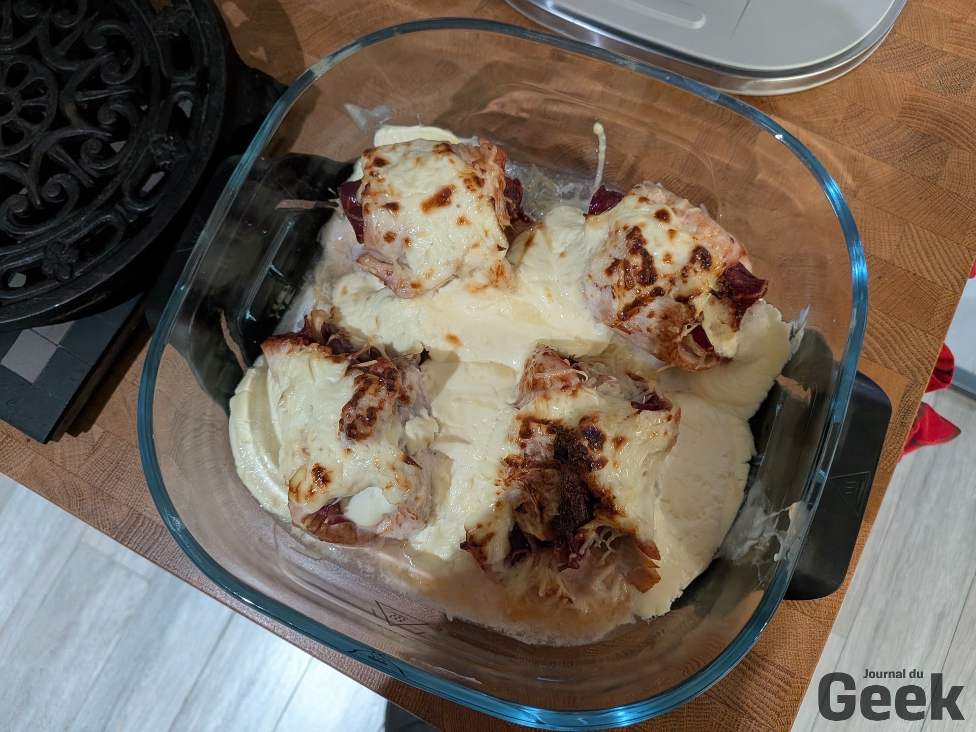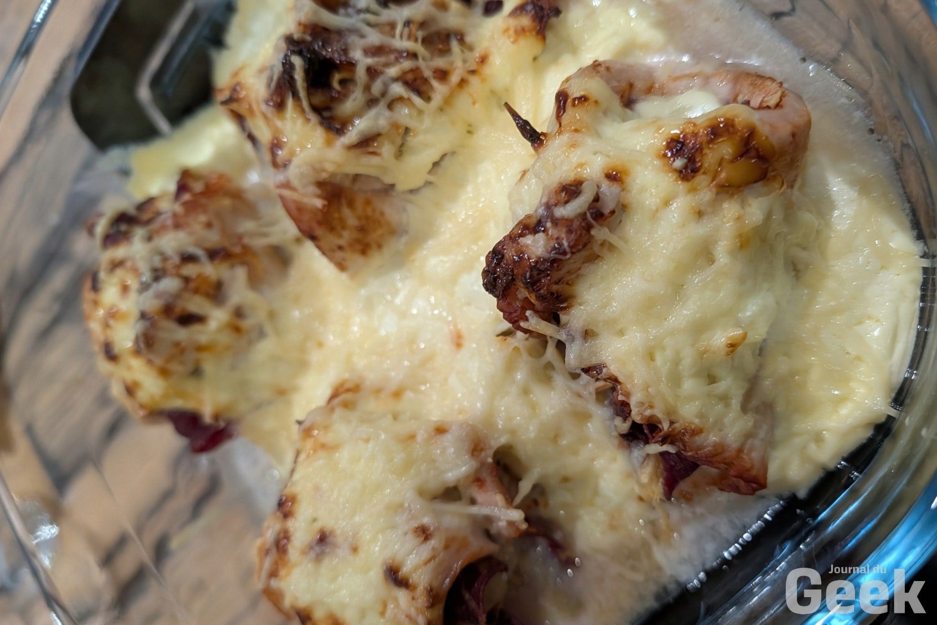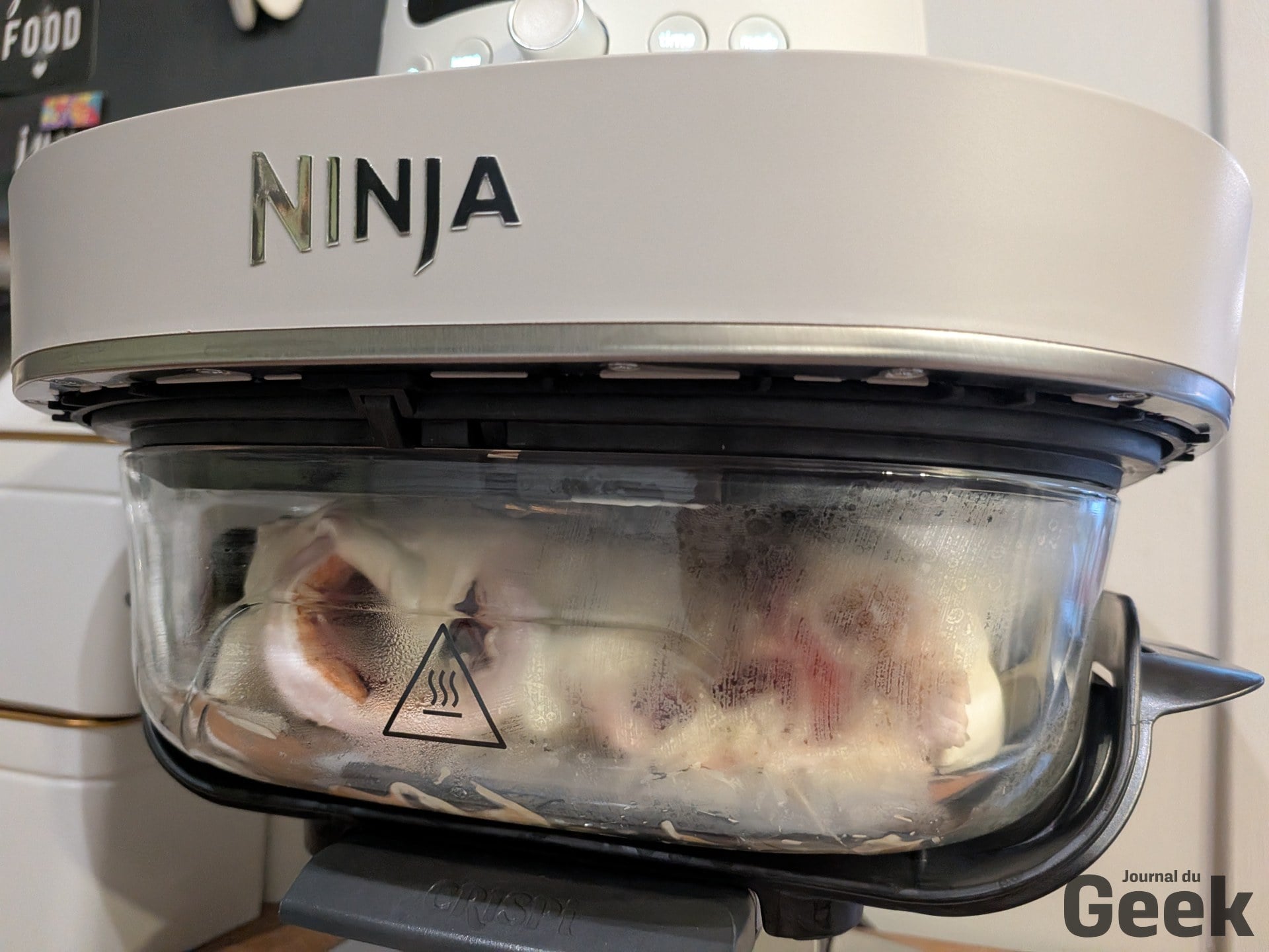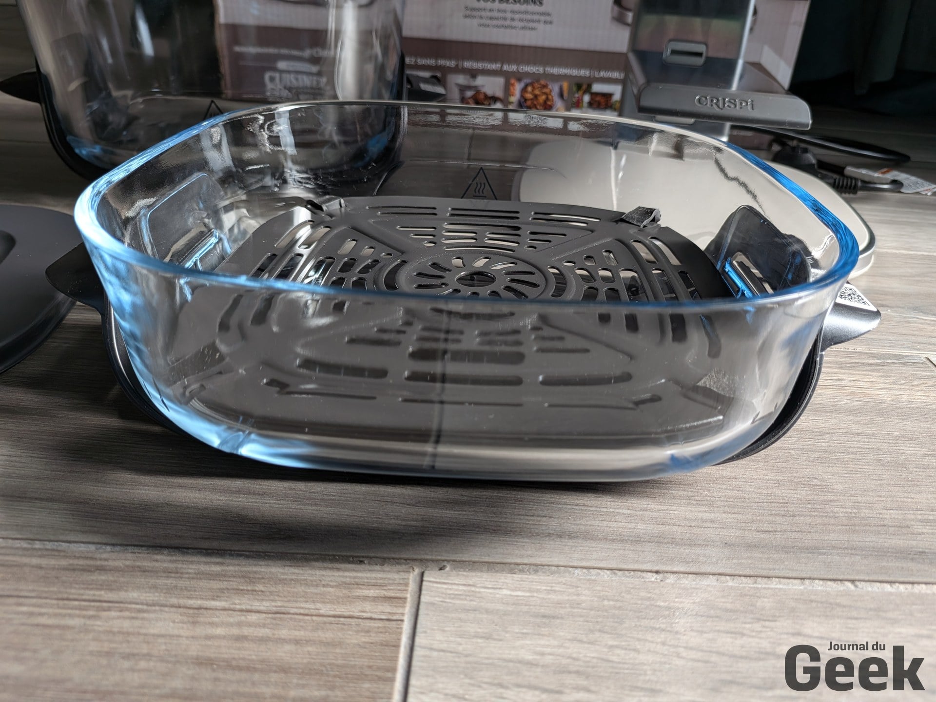 Sur les gratins et les plats à réchauffer, le Crispi Pro révèle ce qu’il y a de plus intéressant dans la conception à cuves en verre : on dépose le plat directement dans le bol sans plaque crisper, et le mode Recrisp se charge de redonner une croûte par le dessus via la résistance haute. Réchauffer un gratin et lui redonner une croûte en moins de dix minutes, c’est précisément l’usage pour lequel ce format n’a pas d’équivalent direct dans la catégorie.
