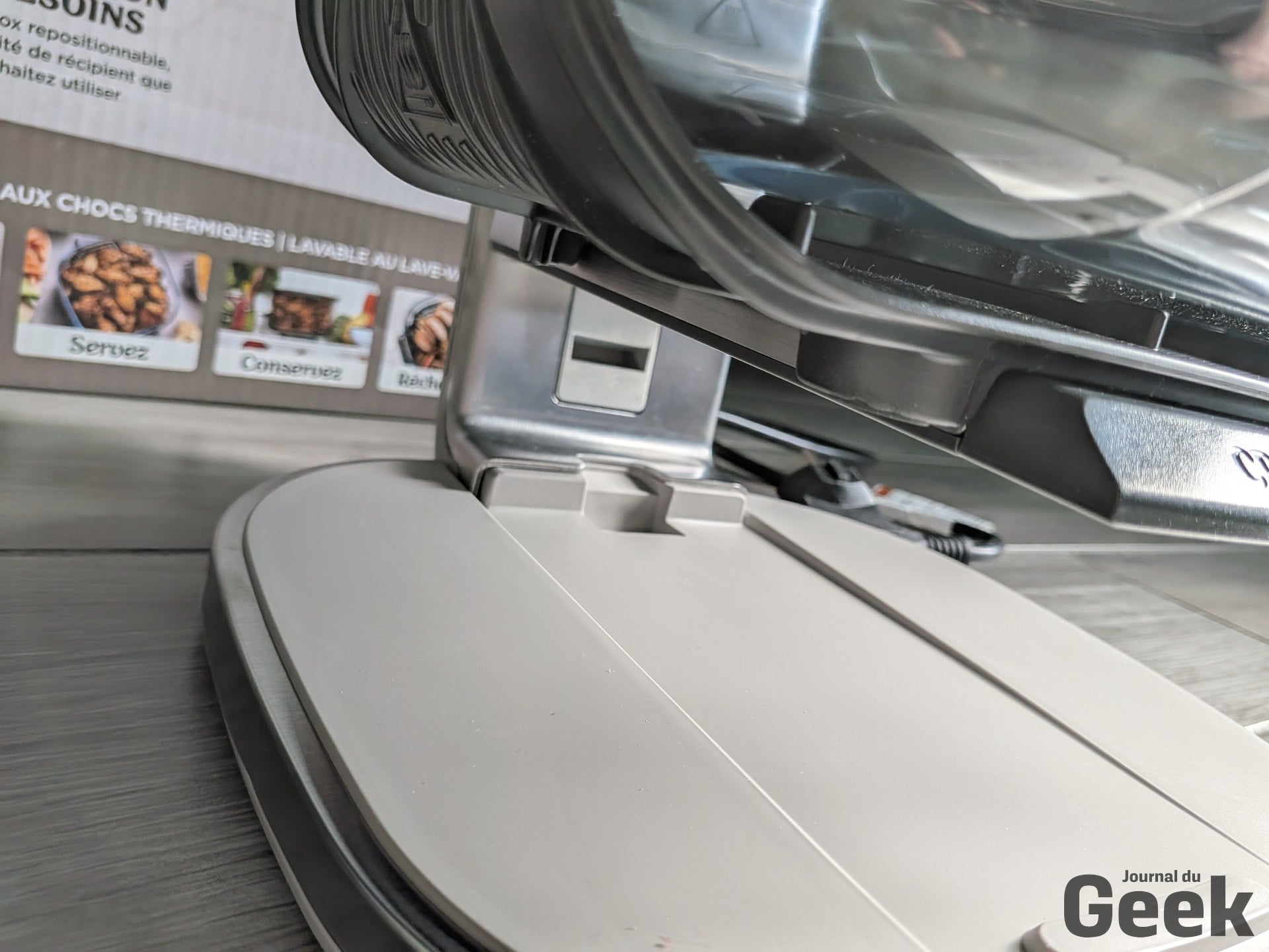 Le bol passe au lave-vaisselle, ce qui est le détail pratique le plus appréciable au quotidien. La plaque crisper aussi, mais son revêtement céramique mérite un traitement doux : pas de tampon abrasif, cycle économique de préférence. C’est le composant le plus fragile de l’ensemble sur la durée.