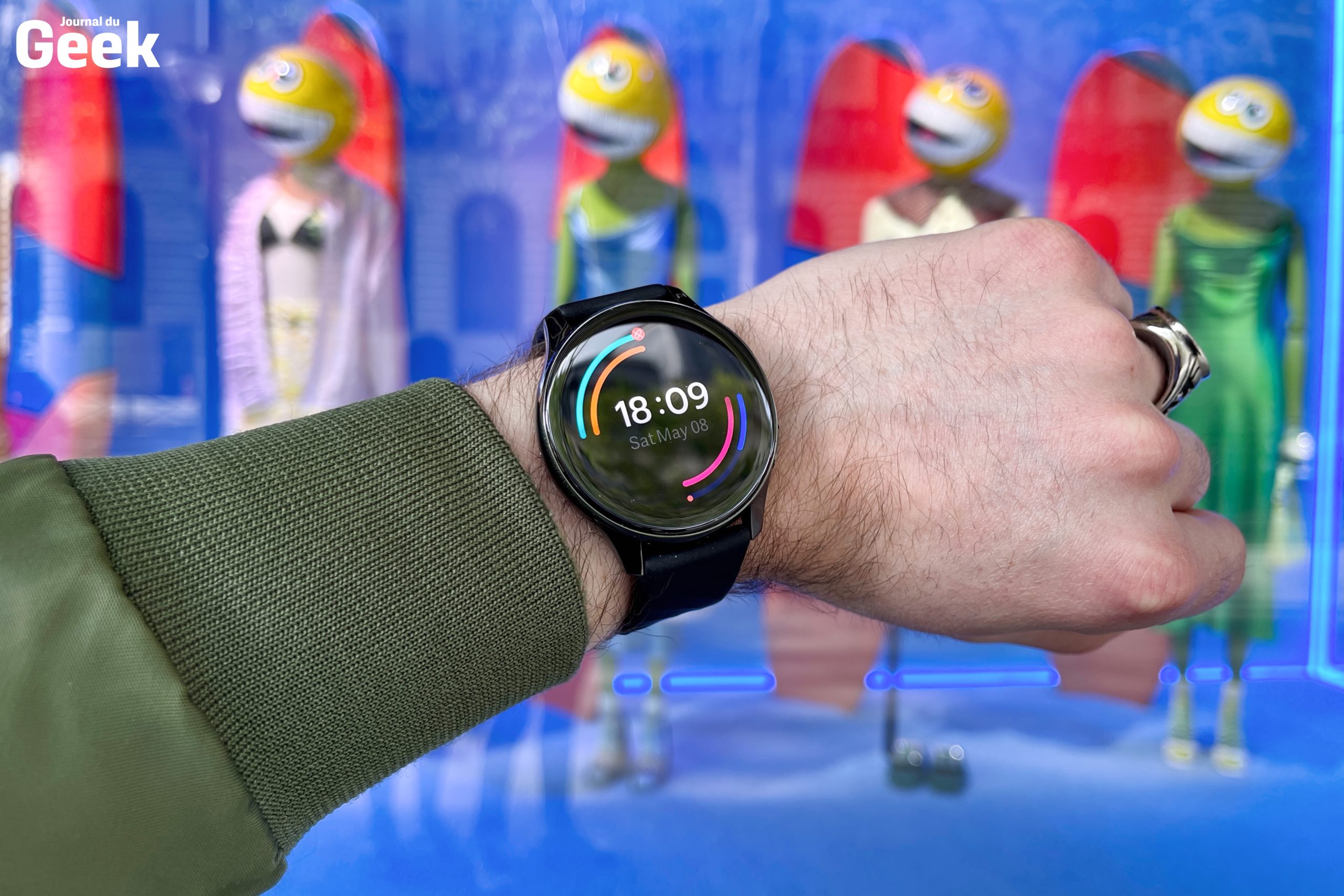 Pour sa première excursion dans le monde de la montre connectée largement dominé par Apple et son Apple Watch, OnePlus a décidé de miser non pas sur un écran rectangulaire mais une dalle AMOLED circulaire de 1,39 pouces (454 x 454 pixels) plutôt lumineuse et parfaitement lisible en tout temps. Son mode luminosité automatique fonctionne parfaitement bien, et permet d’éviter de se griller la rétine pour farfouiller dans les réglages au moment d’aller se coucher.