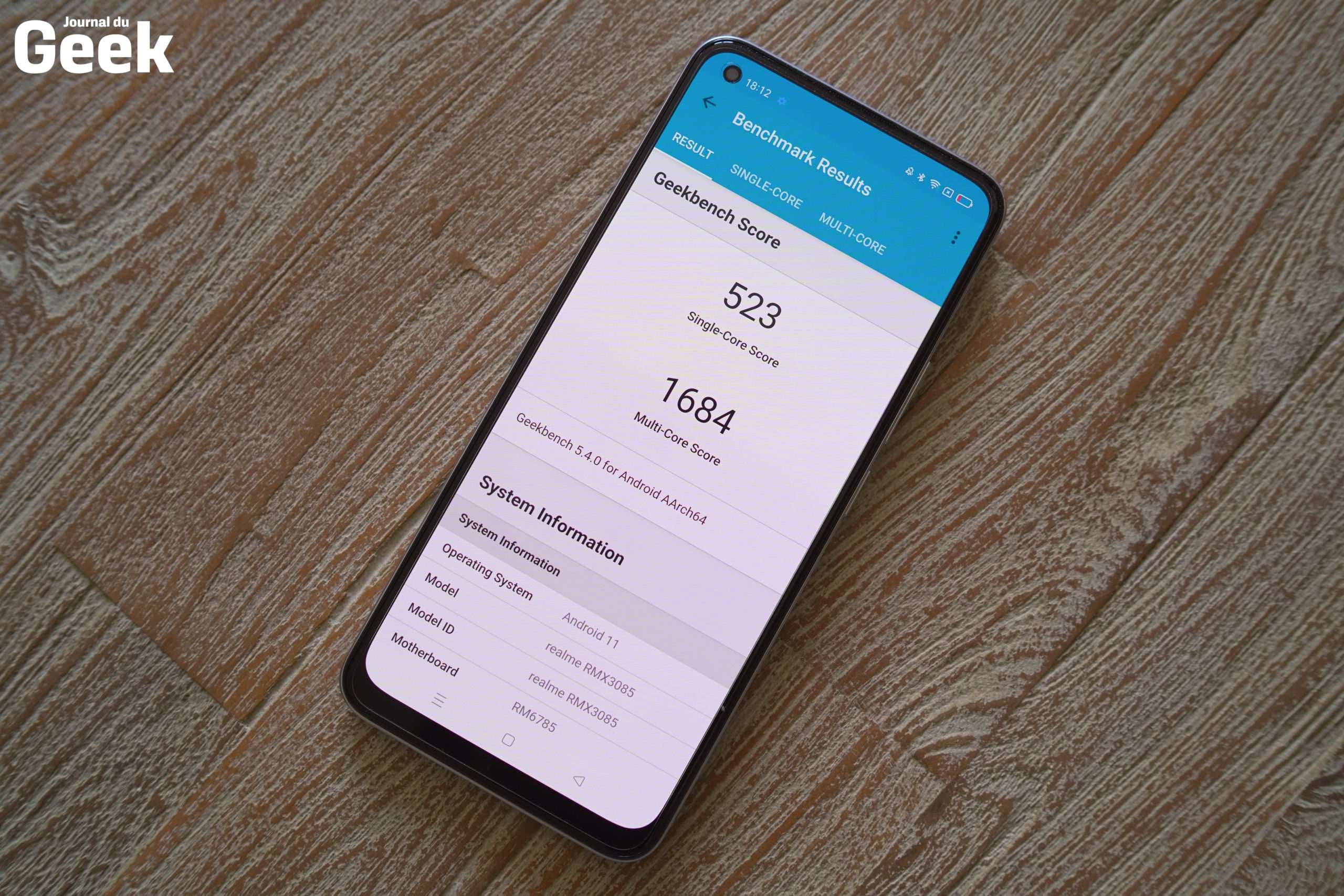 Du côté des performances, le Realme 8 n’embarque pas de SoC de chez Qualcomm comme son grand frère, mais plutôt une puce de chez MediaTek, l’Helio G95. Pensée pour le gaming mobile, cette puce de milieu de gamme se montre plutôt véloce en pratique. Nous n’avons pas constaté le moindre ralentissement en naviguant — parfois de manière intensive — sur le smartphone. Le lancement des applications est rapide, tout comme le basculement d’une app à une autre. Côté jeu, le smartphone se montre étonnamment capable, même s’il faudra abaisser les réglages sur les titres gourmands comme Call of Duty Mobile, pour ne citer que lui. Son seul défaut : ce SoC n’est pas doté d’un modem 5G. Il faudra donc se contenter de la 4G, du WiFi 5 et du Bluetooth 5.0. Mais pour ce prix, on lui pardonne.