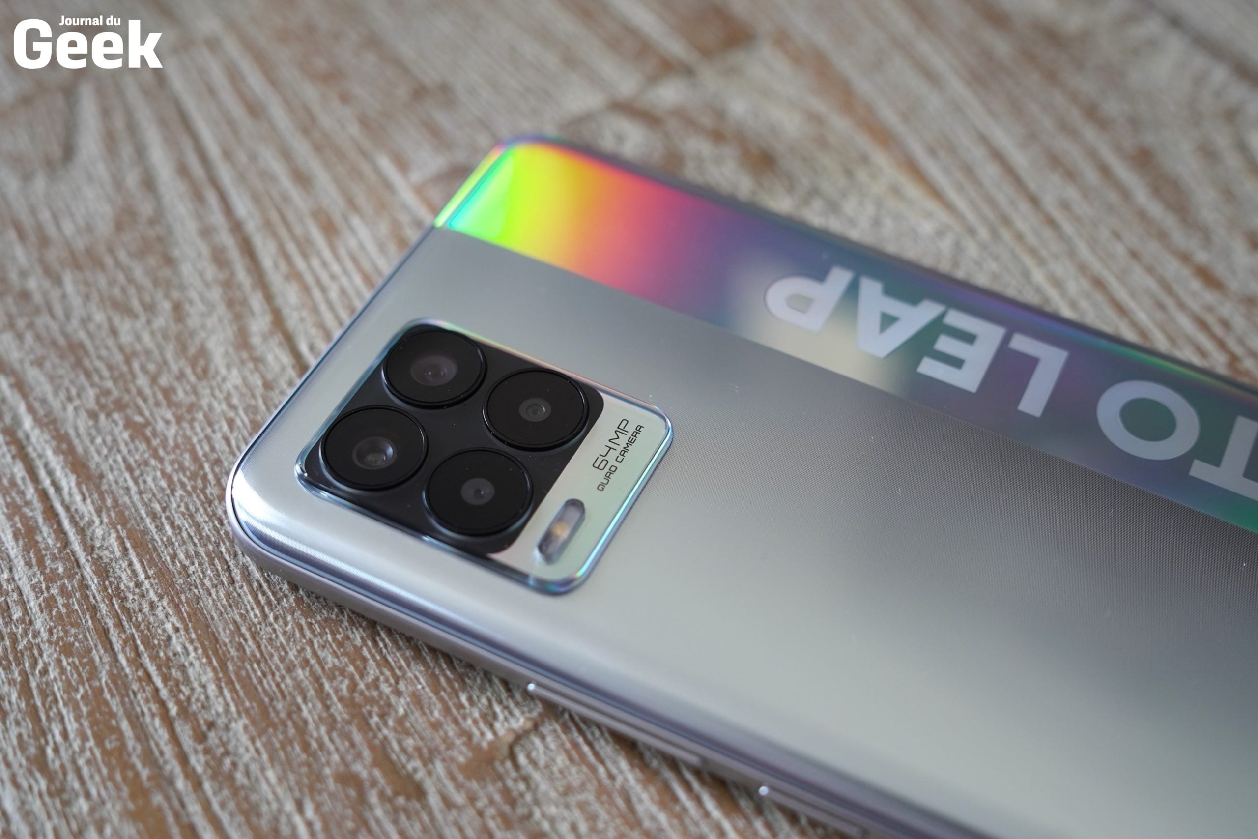 À l’arrière, le Realme 8 arbore un dos en plastique brillant, très brillant même sur une partie. On trouve que cela lui confère un look plutôt premium, mais attention aux traces de doigts. On y retrouve enfin le slogan de la marque, « DARE TO LEAP », gravé en grosses lettres sur la longueur du dos du smartphone. On aimera ou non, mais le Realme 8 a au moins le mérite d’être reconnaissable entre mille. Enfin, le bloc photo est plutôt bien intégré à l’ensemble. Avec ses quatre capteurs, il dépasse assez peu du boîtier. Le smartphone se montre également plutôt fin (7,99 mm d’épaisseur), et léger (177 grammes sur la balance), et la prise en main est convaincante.