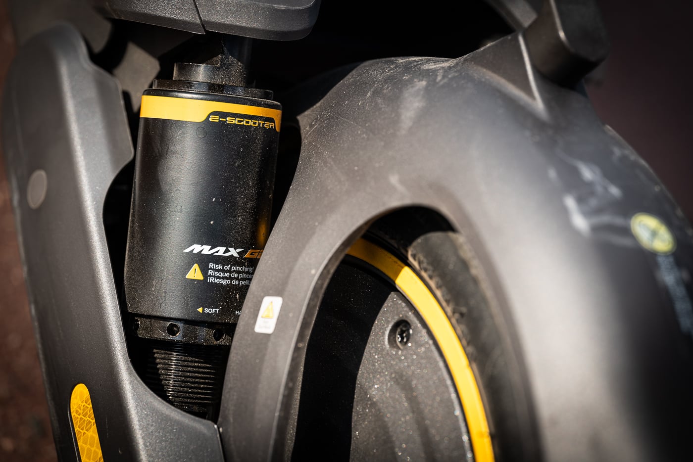 Cette KickScooter MAX G2 est un vrai plaisir à conduire. La suspension arrière à double bras est un peu trop souple pour les 100 kg de votre testeur. Mais la bonne nouvelle, c’est qu’elle est réglable, avec les mentions “soft” et “hard” apparentes. Notez qu’il faut démonter la roue arrière pour y accéder, et cela s’avère très simple.