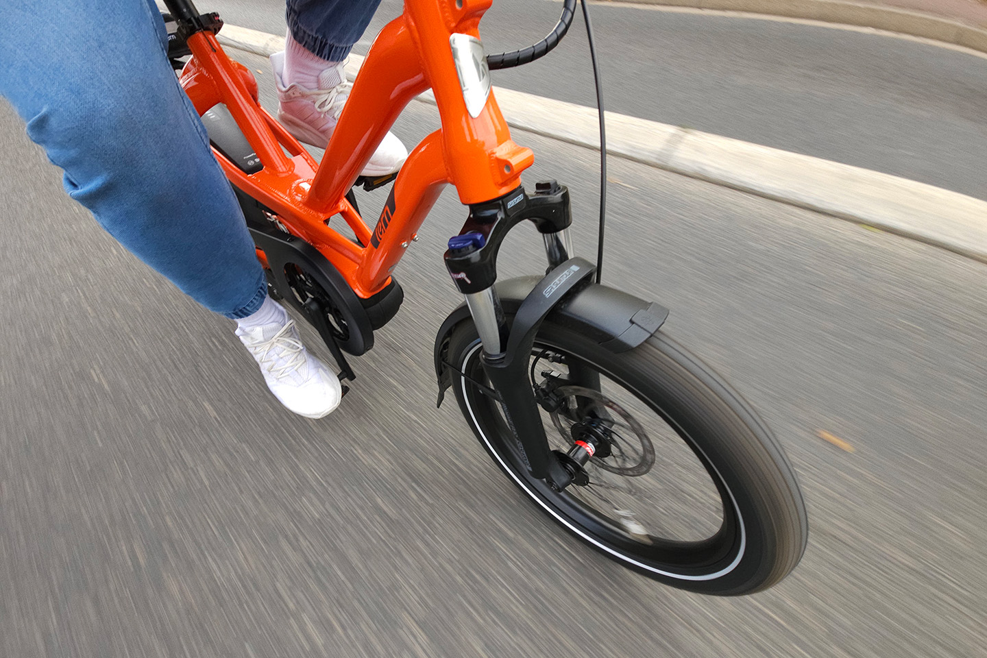 Les premiers tours de roues donnent une sensation “étrange”. Cette expression maladroite décrit la sensation de rouler avec des roues de 20 pouces sur un véhicule qui pèse près de 28 kg. L’inertie est maîtrisée et l’absence de louvoiement est remarquable. La batterie placée au centre du vélo, sous le siège du cycliste, est un excellent choix. Les petites roues rendent le vélo plus réactif.