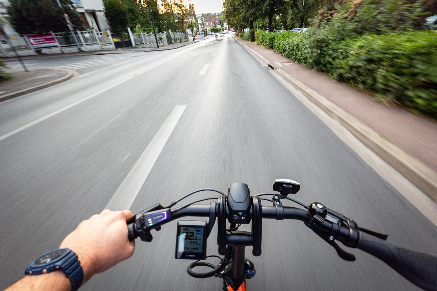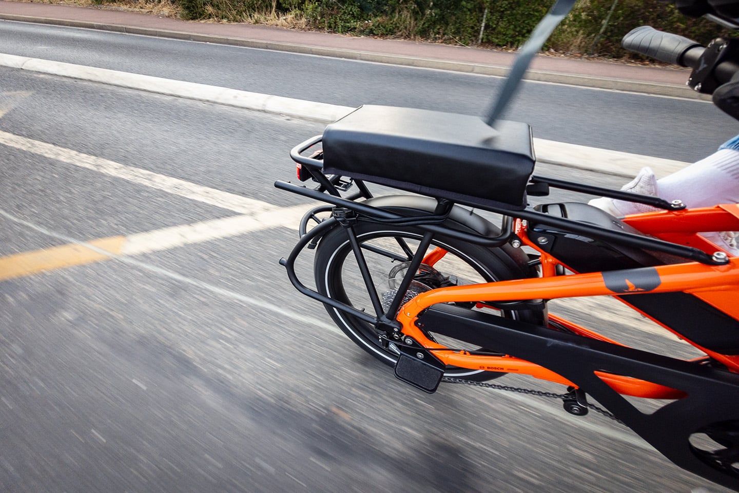 Mis à part ce détail, et la tige de selle qui grince légèrement sous le poids conséquent du testeur, rien à redire. Nous sommes en présence d’un vélo conçu pour durer. De ses roues à son cadre, des pneus à la chaîne, la qualité est au rendez-vous. Et pour cause, ce Tern HSD P10 doit résister aux efforts imposés par la physique et à une charge maximale de 180 kg. Pour rappel, l’énergie cinétique est proportionnelle à la masse multipliée par le carré de la vitesse. Si la loi limite l’assistance électrique à 25 km/h, rien n’empêche d’aller plus vite, notamment en descente.