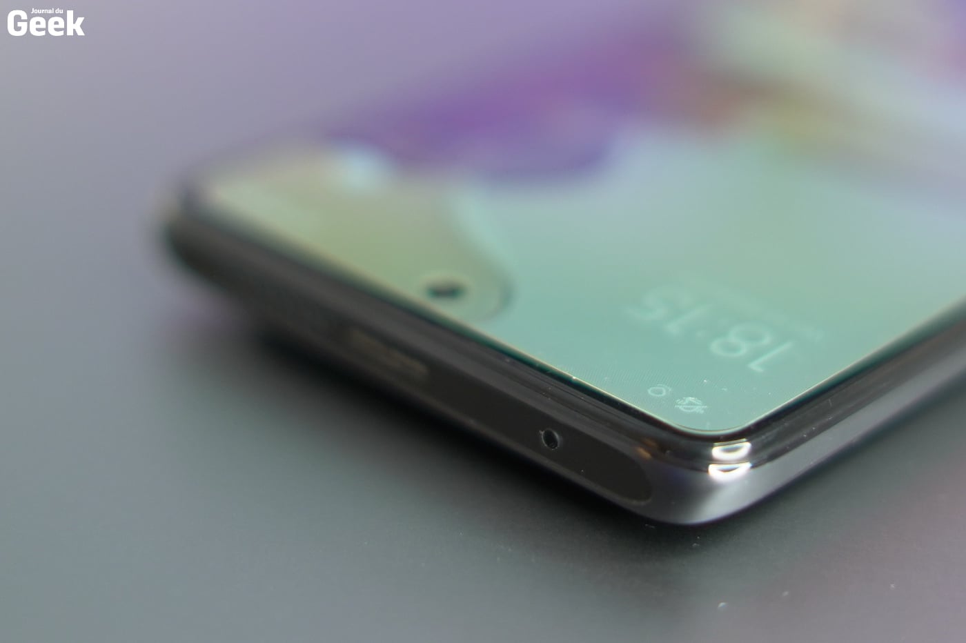 Quant aux tranches, elles sont formées d’aluminium. Tous les boutons sont placés sur la tranche de droite. C’est là qu’on retrouve le capteur d’empreinte digitale, intégré au bouton de déverrouillage. À l’usage, celui-ci s’est montré particulièrement réactif et efficace. On retrouvera deux haut-parleurs, placés respectivement sur la tranche inférieure et supérieure, permettant au smartphone de proposer un véritable son stéréo puissant et clair. Enfin, la tranche du bas recèle un port USB-C pour la recharge et le slot carte SIM.