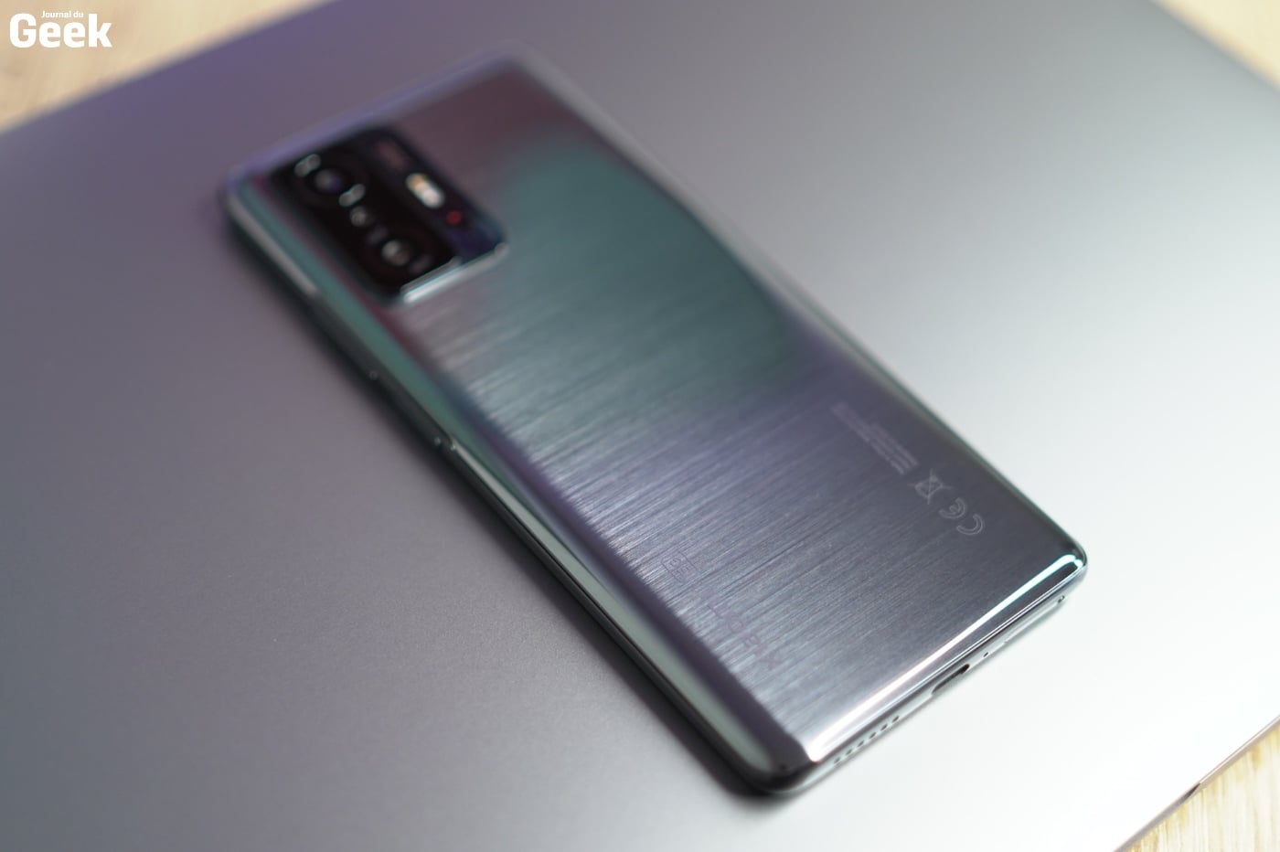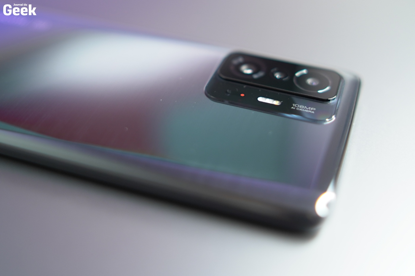 À l’arrière, on retrouve un bloc photo, plutôt imposant lui aussi, qui prend la forme d’un rectangle, placé sur un dos en polycarbonate brillant. À notre humble avis, cet aspect plastique confère au Xiaomi 11T Pro une apparence bien moins réussie que celle du Xiaomi Mi 11. Le revêtement prend énormément les traces de doigts et, au toucher, on a un peu l’impression de tenir un smartphone d’entrée de gamme. Notez qu’il existe d’autres coloris, dont du bleu et du blanc, qui s’avéreront peut-être plus réussis. Enfin, le téléphone profite seulement d’une certification IP53 contre les éclaboussures, et pas de véritable étanchéité IP68. Dommage.