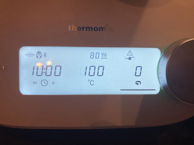 Les réglages, eux, se présentent comme ceux du TM6 : on règle d’abord la durée, puis la température et enfin la vitesse de rotation des lames. Entre les deux derniers paramètres (température et vitesse), une icône clignote pour rappeler de bien placer et fermer le couvercle (car ici, pas de fermeture automatique comme le propose le Thermomix TM6). Il suffit de valider en pressant la molette.