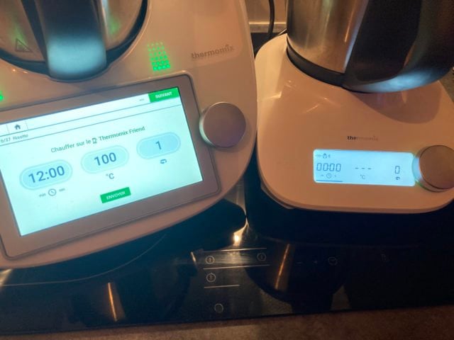 L’utilisation en cuisine guidée nous semble plus pertinente et sans doute aussi plus rassurante. De quoi s’agit-il ? Le Thermomix TM6 propose des recettes pour lesquelles il suffit de se laisser guider pas à pas sur son écran. Les réglages (température, durée de cuisson, vitesse de rotation des lames) sont transmis directement sur le robot depuis la plateforme de recettes Cookidoo (sur abonnement). Cette dernière contient des recettes en cuisine guidée qui incluent le Thermomix TM6 et son petit copain Friend. Les deux étant connectés entre eux, les réglages sont transmis directement sur le petit robot et on est aussi guidé pas à pas de la même manière. Par exemple, on mixe dans le TM6 puis on cuit avec le Friend. Ce dernier est aussi utilisé pour maintenir au chaud.