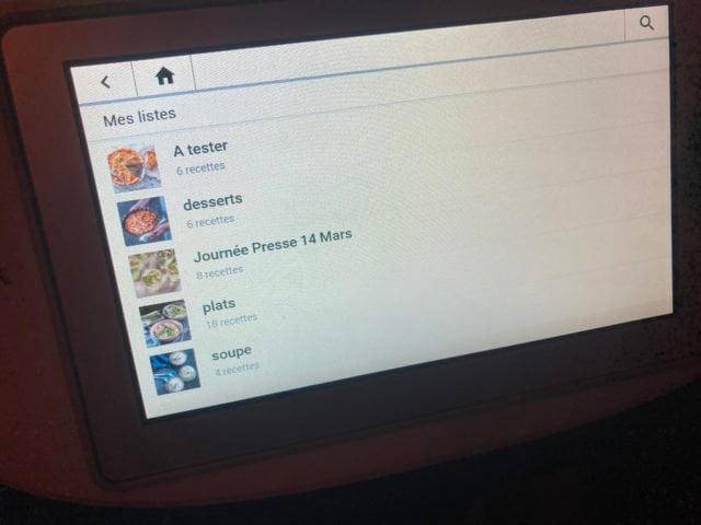 Quand on consulte l’écran du TM6, on retrouve directement toutes les recettes telles qu’on les a classées dans l’appli, par listes ou par menu de la semaine. C’est vraiment bien pensé et ergonomique. La présentation sur l’écran est semblable à celle de la plateforme ; on s’y retrouve ainsi très facilement.