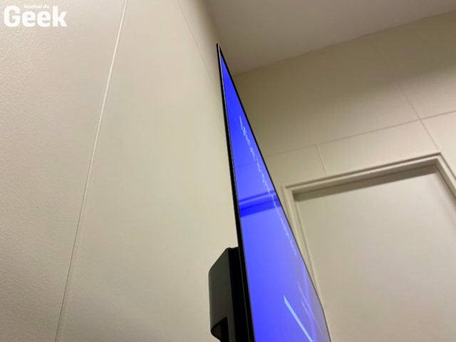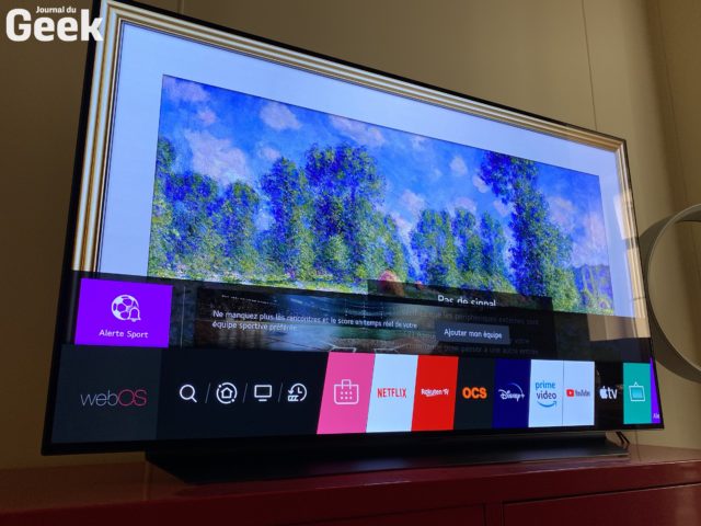 Seul bémol du côté de l’audio, qui manque un peu de coffre, mais c’est aussi dû à la « petite » taille de ce téléviseur OLED comparé à la gamme habituel que nous offre LG. On dispose ici d’un système son très classique composé de deux haut-parleurs de 10 watts et d’un woofer de 20 watts pour une puissance d’amplification totale de 40 watts. Le son n’est pas mauvais, loin de là, mais il ne fait pas honneur à la qualité d’image qui est quant à elle exceptionnelle. Le problème, c’est que le dock central sur lequel vient se reposer la dalle ne permet pas d’y glisser une barre de son pour corriger facilement ce défaut. On devra alors la fixer au mur, utiliser des enceintes sur les côtés, ou alors compter sur des enceintes Bluetooth, qui sont bien entendues compatibles avec ce téléviseur, avec également la possibilité d’y accoler des enceintes Bluetooth LG pour diffuser les effets surround. Notons que le mode AI Sound permet tout de même d’ajouter un peu de profondeur au rendu sonore. On profite sinon du Dolby Atmos.
