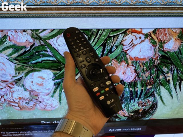 Durant ce test la LG OLED 48CX, on a noté qu’un seul et unique bouton placé sous la dalle, au centre, un peu à la manière des moniteurs de la marque. Tout se passe en réalité sur la télécommande. Celle-ci, plutôt complète, se veut particulièrement ergonomique et efficace, puisqu’elle interagit avec le téléviseur via radio fréquence et non pas infrarouge, ce qui ne nécessite pas de la pointer nécessairement vers le téléviseur. On dispose, au centre, d’une molette pour naviguer dans les menus, que nous avons trouvé plutôt efficace, bien qu’un peu déroutante lors de la première utilisation. Dans l’interface, on profite d’un pointeur, un peu à la façon d’une Wiimote de Nintendo. Ce pointeur fonctionne plutôt bien dans l’ensemble, et il est particulièrement utile dès lors qu’on doive saisir du texte sur un clavier virtuel du téléviseur, mais il a une fâcheuse tendance à se décaler dans un sens où dans l’autre.