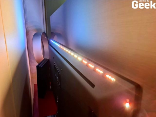 À l’arrière, l’Ambilight, marque de fabrique de la marque, vient enfoncer le clou en matière de design. Le dispositif, formé autour de 37 LED sur ce modèle, permet de « prolonger » d’une certaine manière l’image sur le mur, en répliquant les couleurs présentes aux bords de la dalle. Certains adorent, d’autres détestent, mais on vous avoue qu’on fait plutôt partie de la première catégorie. Jamais l’Ambilight ne nous a fait défaut, et surtout, il parvient nettement à renforcer l’immersion, autant en jeu qu’en plein film. Ce dispositif donne surtout un cachet indéniable aux téléviseurs de chez Philips, puisqu’on ne le retrouve nulle part ailleurs.